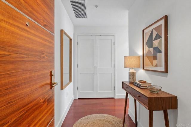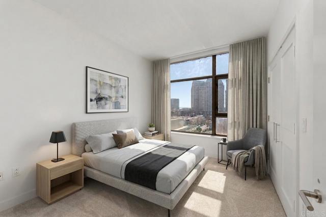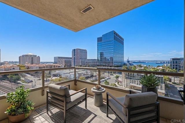 Perched on the 8th floor of the iconic Electra building, this beautiful home features 1315 square feet of meticulously designed living space with 2 bedrooms, 2 bathrooms PLUS a den. Nestled in the heart of San Diego's vibrant Columbia District, this property truly offers the ultimate urban lifestyle. Panoramic southwest-facing views of the bay, skyline, and the building's serene pool area! Upon entry, you're greeted by an abundance of natural light streaming through expansive windows, highlighting the open-concept layout. The living and dining areas seamlessly flow into a private balcony, perfect for al fresco dining or simply enjoying the views and coastal breezes. High-end finishes in the kitchen include stainless steel appliances and sleek slab granite countertops. The primary suite offers a tranquil retreat with two closets and a spacious spa-like bathroom featuring a soaking tub and separate shower. An additional bedroom and a versatile den provide flexibility for guests, a home office, or workout room. Additional features include fresh paint, new carpet in bedrooms, modern track lighting, and a cozy living room fireplace. Residents of this boutique building enjoy a range of amenities, including a heated pool, spa, fitness center, and 24-hour staffed lobby. With a Walk Score of 96, you're just steps away from the waterfront, Seaport Village, Little Italy, and and some of San Diego's best dining and entertainment. Don’t miss your chance to call this exquisite residence home. Please note that select photos are virtually staged.