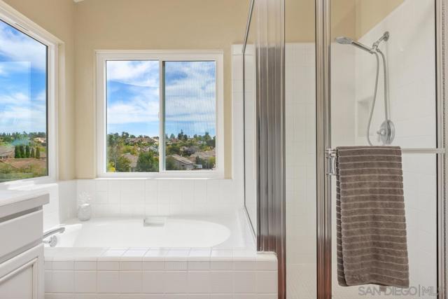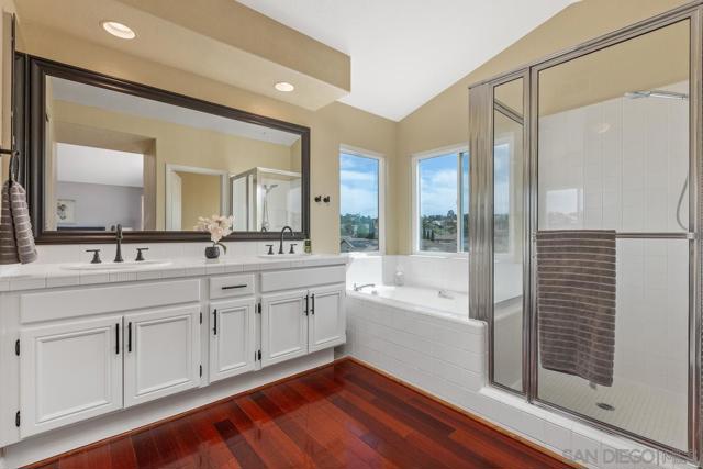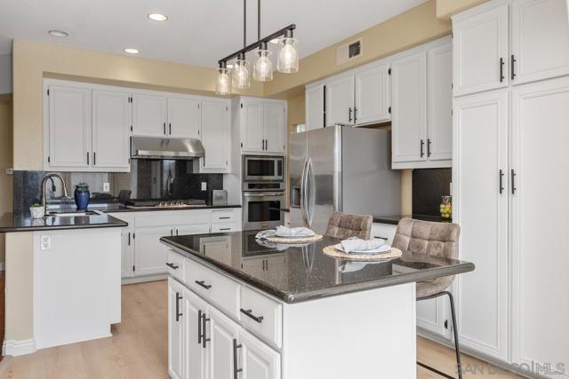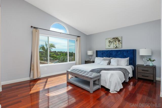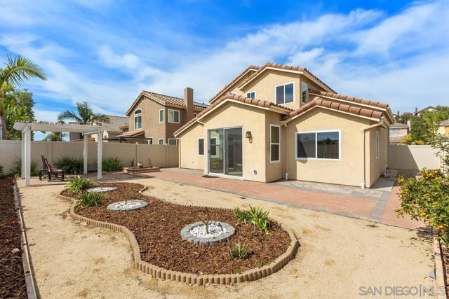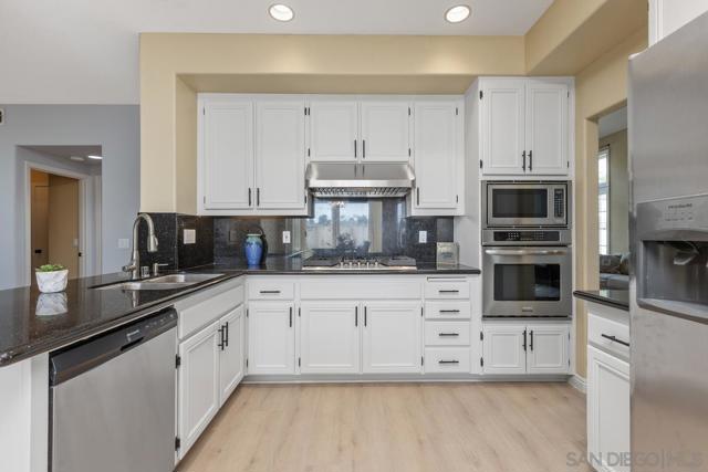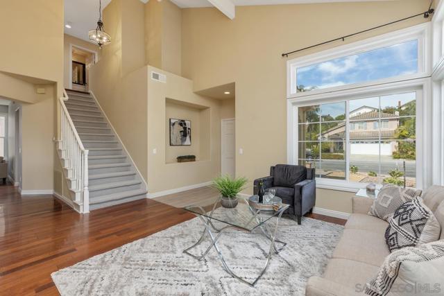Beautifully upgraded Rancho Peñasquitos home with vaulted ceilings, brand-new windows, and abundant natural light throughout. This move-in ready property features solid hardwood floors and a desirable south-facing backyard that fills the home with sunshine. Flexible floor plan includes two bedrooms and a full bath and a powder room on the main level with a total of 5 bedrooms and 3.5 bathrooms. The spacious kitchen offers granite countertops, center island, stainless steel appliances, double ovens, gas range, and an eat-in dining area overlooking the backyard. The sliding glass doors off the kitchen/breakfast area create seamless indoor-outdoor living, opening to a private patio with outdoor dining and raised seating — perfect for entertaining. New trending landscape with low maintenance and drought tolerant features. Located in a highly sought-after neighborhood close to top-rated schools, parks, and shopping — this is Southern California living at its best.