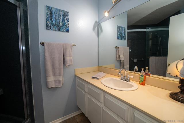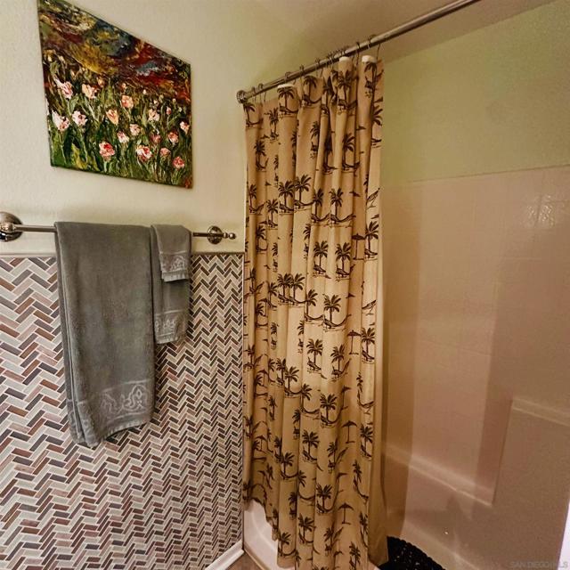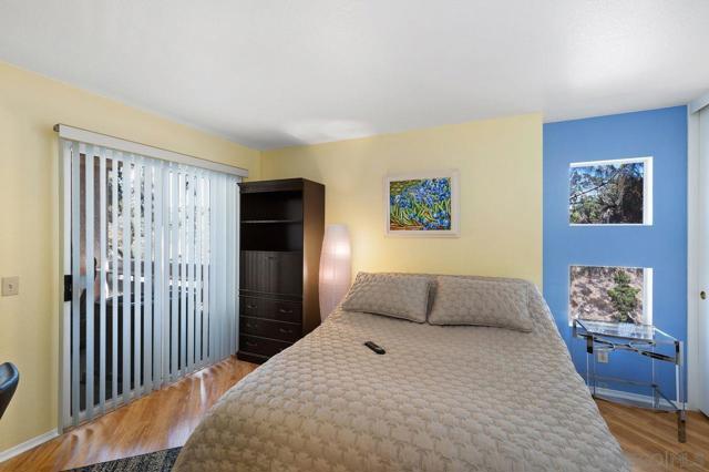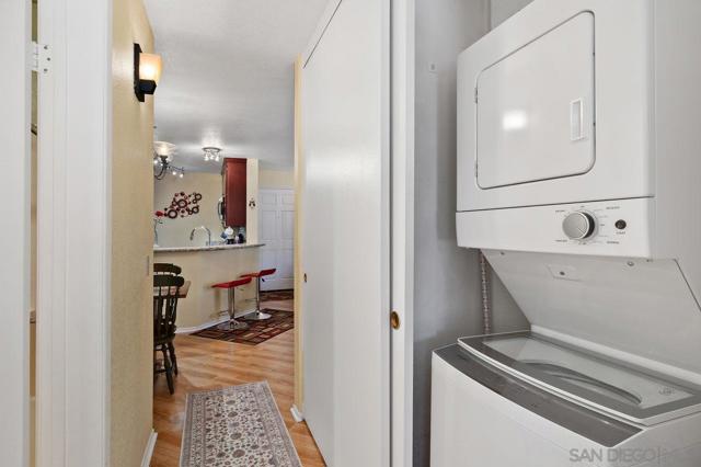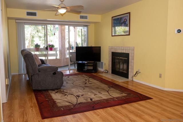 Welcome to this charming 2-bedroom, 2-bath condo in the highly desirable Fashion Valley area, offering comfort, convenience, and rare no-stairs access, located just 10 feet from your private 2-car garage. The kitchen features beautiful cherry wood cabinetry, granite countertops, and generous storage. Additional highlights include laminate flooring throughout most of the home, a stacked laundry unit, and a private covered patio ideal for relaxing or entertaining. The primary bathroom includes a walk-in onyx shower with a built-in seat, adding both style and functionality. Recent upgrades include a new furnace, air conditioning unit, and water heater, providing peace of mind for the next owner. Residents enjoy excellent community amenities including a saltwater-filtered lap pool heated to 81° year-round and a fully equipped fitness center. Ideally located in the heart of San Diego, this home is less than half a mile from Fashion Valley Mall and just a short 10-minute drive to the beaches and downtown San Diego. The unit is currently mostly vacant, making it easy for buyers to envision their own furnishings and style in the space. Some images in this listing have been digitally altered for illustrative purposes. Original, unaltered images are included.