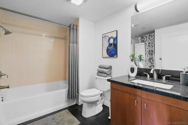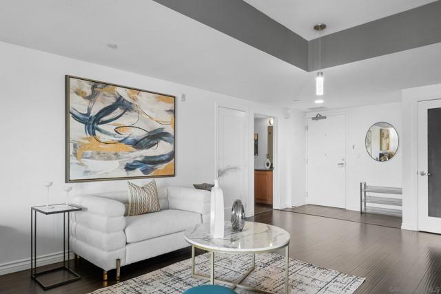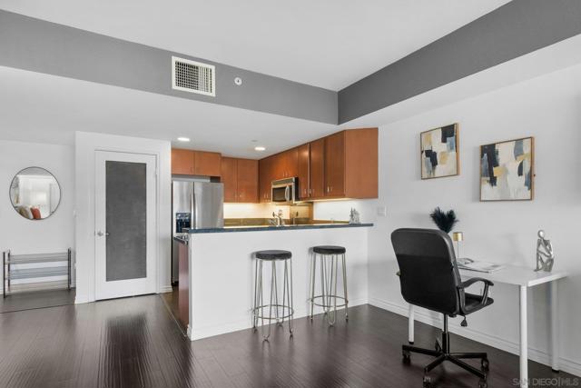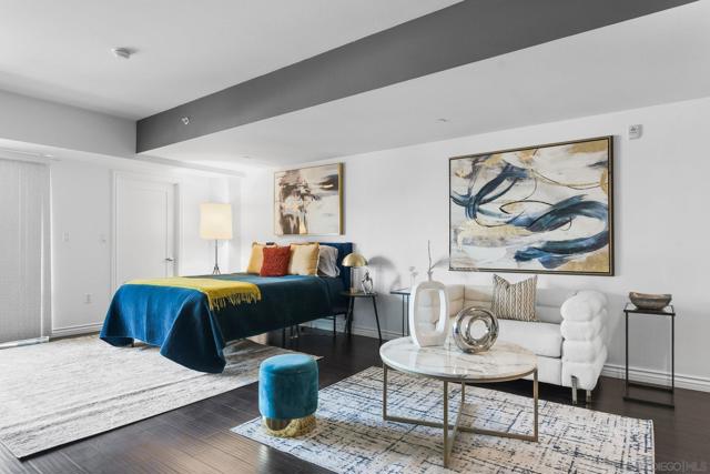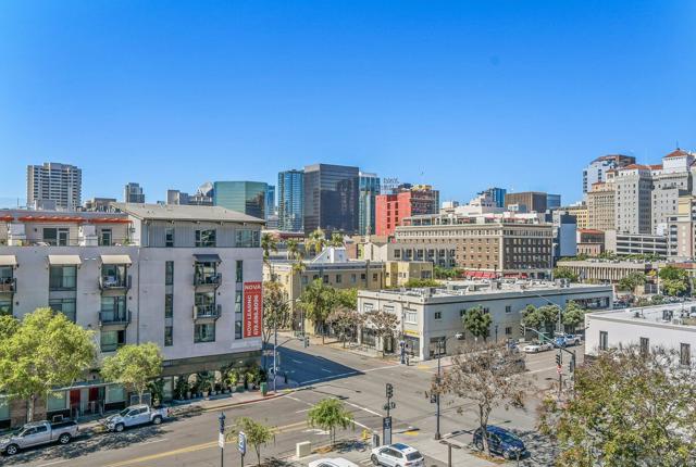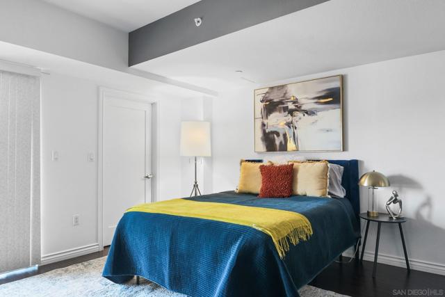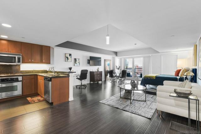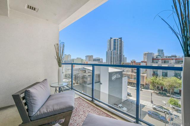 Exceptional location with walking distance to Petco Park, the Convention Center, Gaslamp, and more! This spacious 760 sq ft studio on the 5th floor features a modern kitchen with granite countertops, tile, and laminate wood flooring, and stainless steel appliances. Enjoy beautiful city views from the balcony accessed through a glass slider. The bathroom includes laundry hookups, and the unit is equipped with a rare walk-in closet, adding to its appeal. Larger than most 1-bedroom condos, this unit also comes with an assigned parking space. Upon stepping outside, you'll find the ambiance open, clean, and airy. The building is meticulously maintained and offers a fantastic gym with an open floor plan. This building sits in a great location, low density corner. Don't miss this incredible opportunity!