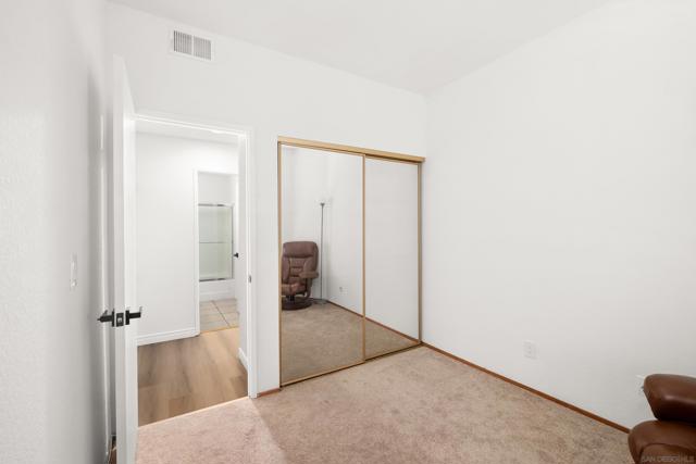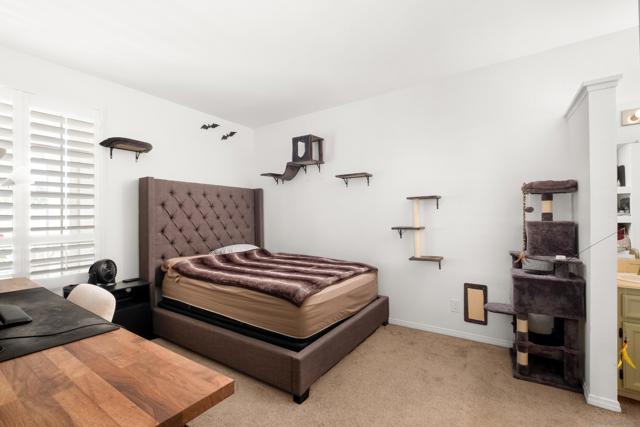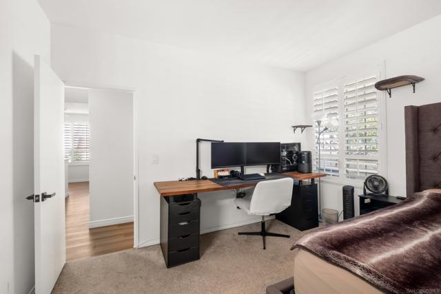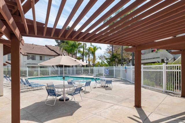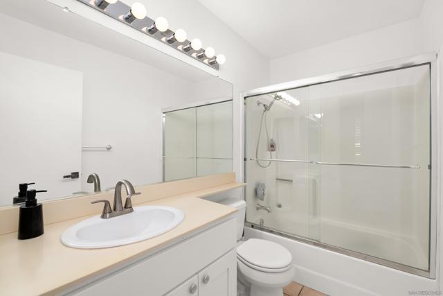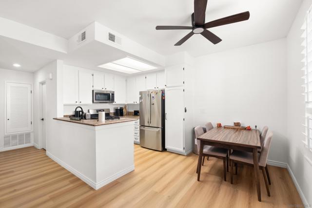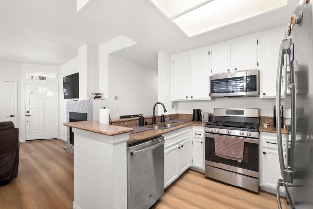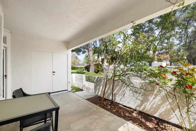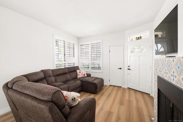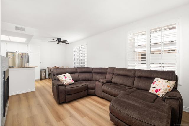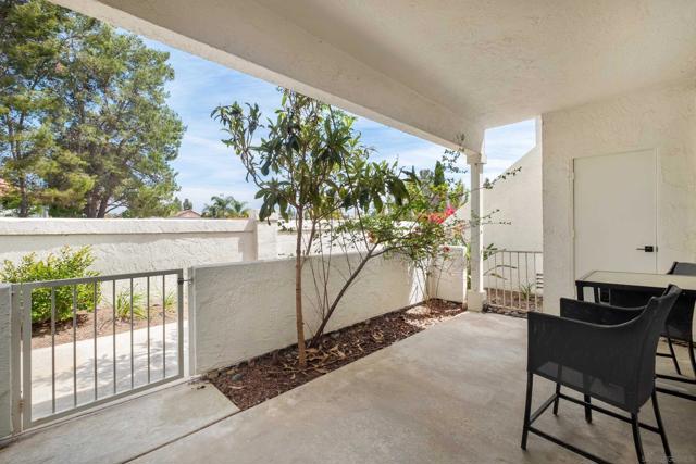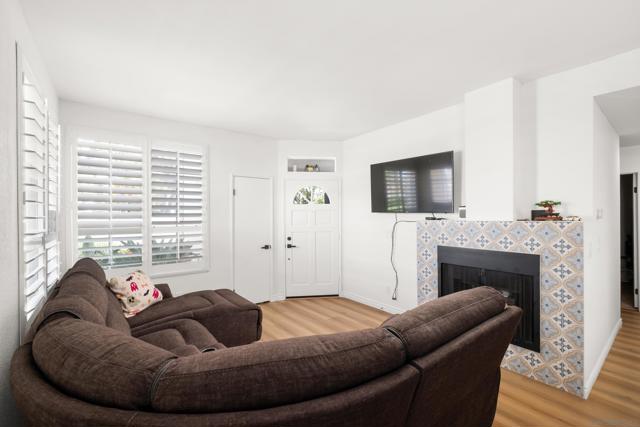 Welcome to an elegantly updated home tucked away in a private northwest-facing pocket of the desirable Canyon Bluffs community in Mira Mesa. This light and bright 2-bedroom, 2-bath residence offers a comfortable layout with natural light throughout and easy single-level living. The interior features a functional kitchen with ample cabinetry and two spacious bedrooms, including a private primary suite. Luxury waterproof oak-tone vinyl plank flooring runs throughout, complemented by matte black fixtures and a designer tile fireplace that adds warmth to the living space. Wood plantation shutters bring in natural light to the main living areas, while the bedrooms offer peaceful, park-like views of mature trees and open skies beyond the patio. Remodeled in 2023, the home also includes a full-sized laundry, a spacious storage closet, and additional storage near the dedicated parking space. A short walk to the community pool and spa. Conveniently located near shopping, dining, parks, and easy freeway access. This home offers a rare combination of comfort, convenience, and value. Welcome home!