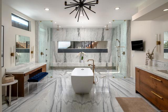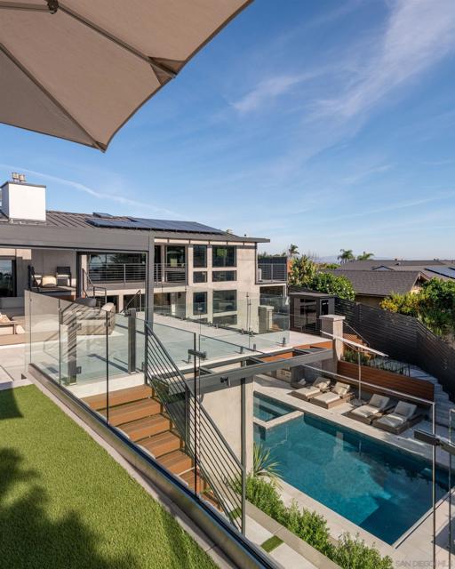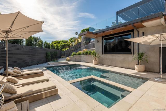 Welcome to Rutgers Road, a beautifully constructed ocean-view residence in La Jolla where no detail has been overlooked, with over $1.2M in professionally designed upgrades. Showcasing exceptional landscape architecture, the outdoor spaces feature an ocean-view pool and spa with a cascading waterfall, outdoor movie theatre, and multiple thoughtfully designed living areas and amenities. Perched in the iconic hills overlooking the Pacific, the home spans three levels yet lives primarily like a single story, with the main floor offering the kitchen, living room, view deck, primary suite, two additional bedrooms, office, laundry, pantry, garage access, and a private housekeeper’s room—an incredibly rare layout for a home of this scale. The primary suite is a true retreat, featuring a spa-inspired marble bathroom with heated floors and a spacious walk-in closet. Extensively upgraded throughout, the home blends refined interiors with resort-style outdoor living. The backyard has been transformed into a private oasis with a new pool and spa, elevated terrace with glass railings, Trex decking, outdoor kitchen and BBQ, fire pit, motorized pergola with heaters, infrared sauna, and cold plunge, all enhanced by professional landscaping, drainage, and lighting. The front yard offers striking curb appeal with curated landscaping, including King Palms, olive trees, and a statement fountain. Additional upgrades include exterior and structural improvements, custom railings, upgraded electrical and AV systems, solar, security, and custom window treatments. A true turnkey offering combining