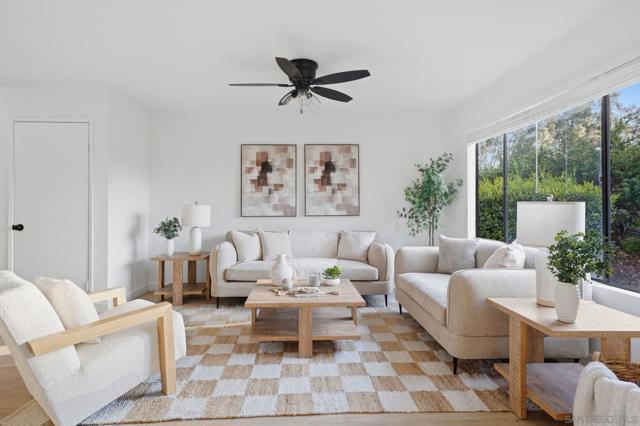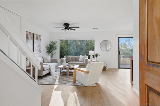Newly remodeled townhome in the desirable Glenwood Springs community of Scripps Ranch. The renovation includes a stylish new kitchen, remodeled bathrooms, brand new central AC/heat, LVP flooring throughout, new fixtures, and much more. Inside you will find a spacious and open living area great for entertaining. Outside you will find three private outdoor spaces including a front courtyard, back patio, and a balcony with views of the eucalyptus trees and grassy area in the back. This unit is in a great location within the community with no neighbors behind. There is plenty of guest parking in the complex, along with a pool and tennis courts. Located across the street from Miramar Reservoir with fishing, kayaking, and hiking. In close proximity to highly rated schools, the lake, nearby restaurants, and the 15 freeway.