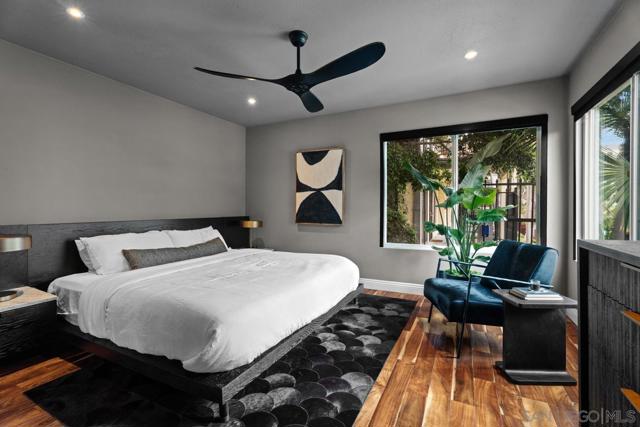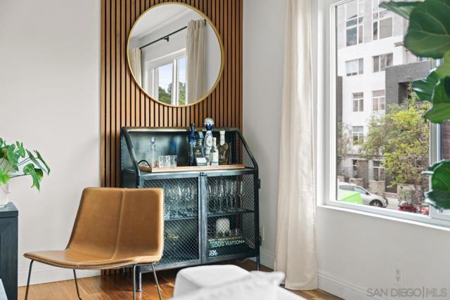 Tucked into the heart of Cortez Hill at Park View, this southwest-facing corner residence offers a rare blend of natural light, privacy, and design. Perched above a quiet, tree-lined street, the home is wrapped in windows and filled with light throughout the day, creating an open, inviting feel that’s hard to find downtown. Just moments from Little Italy and Balboa Park, the location delivers both walkability and a more residential setting. Extensively updated, the home features acacia wood floors, smooth-coated walls, and curated finishes throughout. The living and dining areas are anchored by custom wood slat accent walls and designer lighting, including a Crate & Barrel chandelier and CB2 fixtures, adding warmth and architectural interest. The kitchen offers granite countertops, stainless steel appliances, and a seamless connection to the main living space. Both bedrooms are generously sized, including a primary suite with an ensuite bath, ample closet space, and motorized blackout shades. Bathrooms have been tastefully remodeled with a clean, modern design. Additional highlights include a large in-unit laundry room, two side-by-side parking spaces with EV charging, and a brand new HVAC system. New windows and southwest exposure enhance natural light throughout. Smart home features include Philips Hue lighting, smart switches, Nest thermostat, and SimpliSafe security system. The home blends thoughtful design with modern convenience in one of downtown San Diego’s most desirable neighborhoods.