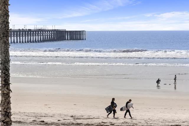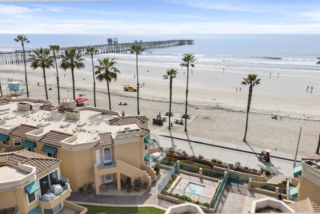 Experience breathtaking front-row coastal living at 400 N The Strand #27—a beachfront gem in the coveted San Miguel III community. This rare ground-level unit offers no-stairs access, making beachside living both luxurious and effortless. Enjoy panoramic white water ocean views and the soothing sound of waves from the comfort of home! Inside, the condo features fresh paint and tastefully updated bathrooms, creating a clean and modern coastal vibe. The open-concept living space is filled with natural light and opens directly onto an ocean-view patio—perfect for dining al fresco or soaking in the sunsets over the Pacific. As evening falls, take in the magical sight of the Oceanside Pier glowing against the night sky—an unforgettable view right from your living room or patio. The spacious primary bedroom features a walk-in closet and dual sink vanity. Additional highlights include in-unit laundry, a cozy fireplace, and two assigned underground parking spaces in a gated garage with elevator access. Ideally located just a short stroll from the Oceanside Pier, marina, and vibrant downtown, this home puts you steps away from Oceanside’s best dining, coffee shops, and boutique shopping. San Miguel III is a well-maintained beachfront community featuring two spas, beautifully landscaped grounds, and multiple access points to the sand. Whether you're looking for a peaceful beachfront escape or an unbeatable location to enjoy all that Oceanside has to offer, this is your chance to own a front-row seat to Southern California’s iconic coastline.
