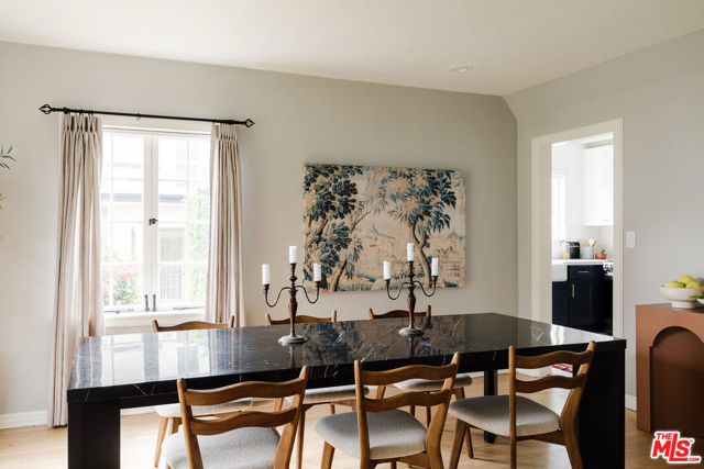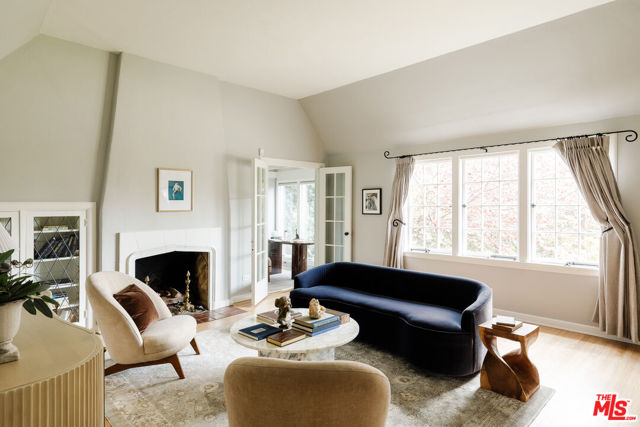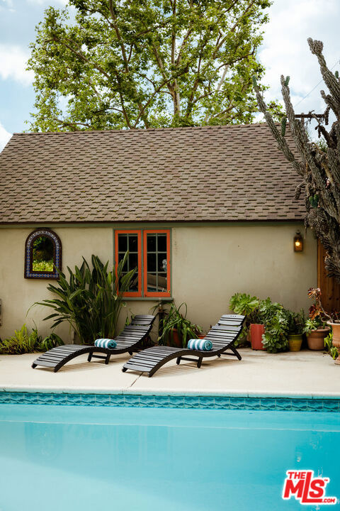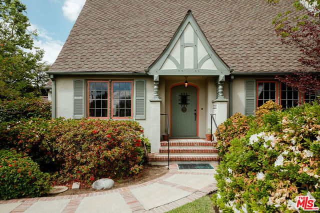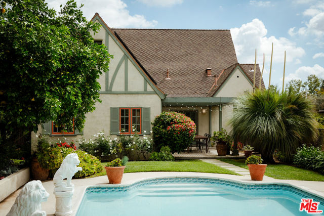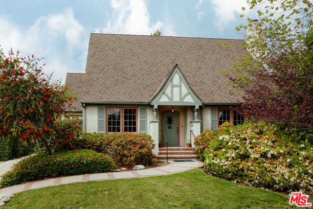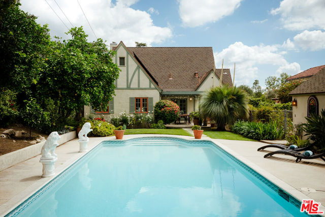 Nestled on an expansive 11,000 sq ft lot, this enchanting 2-bedroom, 2-bathroom Tudor-style home perfectly blends timeless architectural character with modern conveniences. From the moment you arrive, you are greeted by a large lot with manicured gardens and towering hedges that create a secret sanctuary, feeling worlds away from the hustle and bustle. The exterior's classic design invites you in, while the meticulously maintained interiors showcase the perfect blend of vintage charm and contemporary upgrades. Inside the living room you are greeted by lots of natural light, recently refinished original wood floors, a beautiful built-in shelf, a cozy fireplace and high ceilings. The spacious dining area is ideal for both everyday meals and entertaining. The kitchen boasts LG appliances, ample counter space, and plenty of natural light. The primary bedroom is a tranquil retreat, boasting a walk-in closet, en suite bathroom, and direct access to the back patio and pool through classic French doors. The outdoor area is a true oasis. Enjoy a coffee under the shade of the back patio, take a dip in the large pool adorned with majestic lion fountains, or catch some sun in the spacious and private back yard. The property has old growth fruit trees including a cumquat, pomelo, orange, lemon, avocado and few exotic plants like the Australian Grass Tree. The garage offers versatile bonus space that could be converted to an ADU, office or for use as storage. This property is in a quiet and serene part of Altadena with spectacular mountain views. It's just a short walk to Prime Pizza and minutes from Stater Brothers. This property is a quiet retreat that captures the very best of life in Altadena.
