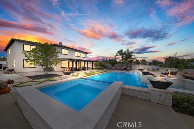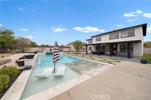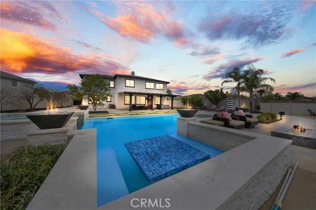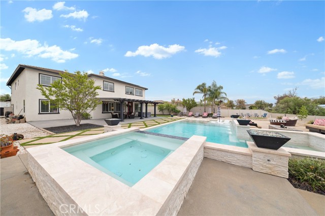 Over Half an Acre with a resort style backyard and spacious thoughtfully designed interior in Murrieta's Concord Estates. The Bordeaux is situated on an expansive lot and this stunning home offers over 3,600 square feet of beautifully appointed living space. From the moment you arrive, you’re greeted by a beautifully manicured landscape and sense of an upscale design that continues throughout the home. Inside, the home offers a versatile and highly desirable layout. Large kitchen with large island and walk-in pantry open to the warm family room with custom built-ins and a striking stacked stone fireplace. Dedicated office, ideal for remote work or creative space. Large primary suite with his and hers closets and a retreat, offering the perfect space for relaxation, reading or a personal lounge. Main-floor bedroom with full bath, perfect for guests or multigenerational living. All bedrooms have walk-in closets. An incredible game room with fun-filled memories just waiting to be created. The game room does have a closet and bath, so it could be converted to a 5th bedroom if so desired. Outside, it offers your own private paradise featuring a custom-designed pool with beach entry, baja shelf, cascading waterfalls, dramatic fire bowls and additional gas firepit that create a truly unforgettable ambiance. A massive spa invites you to unwind under the stars, making every evening feel like a luxury getaway. With its rare combination of lot size, square footage and resort-caliber outdoor living, this home stands out, delivering the perfect blend of elegance, comfort and entertainment.