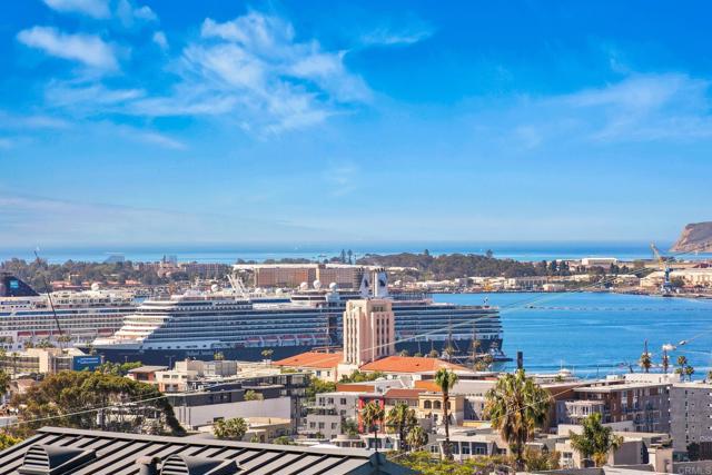 One for the money & two for the show! Top-floor, west-facing condo in south Bankers Hill offers amazingly big panoramic views for under $1 million. The pretty blue waters of San Diego Bay and the Pacific Ocean set the stage, and this condo captures the dynamic atmosphere of San Diego's waterfront. The 2 bdrm, 2 bath, end-unit condo has a split bdrm floorplan, with 2 west-facing balconies. There are 2 gated parking spaces (tandem). New flooring & paint; dual-pane windows. Located across the street from the iconic Hob Nob Hill restaurant, and easy walking to Balboa Park & museums, eateries, and coffee houses of Bankers Hill. Close to downtown, Little Italy, SAN airport, beaches & freeway.