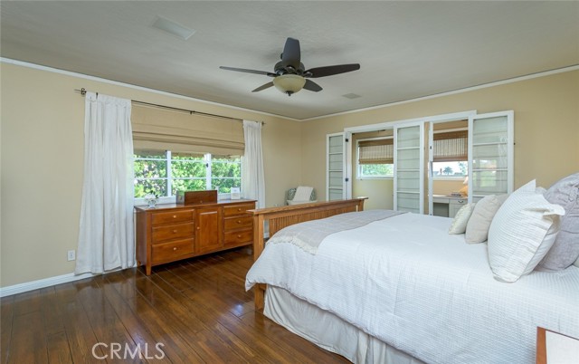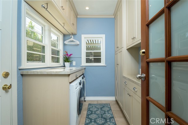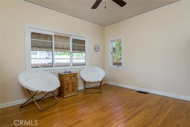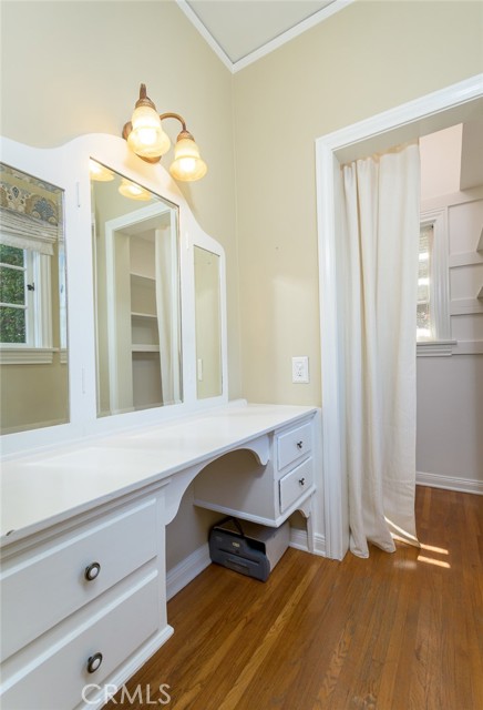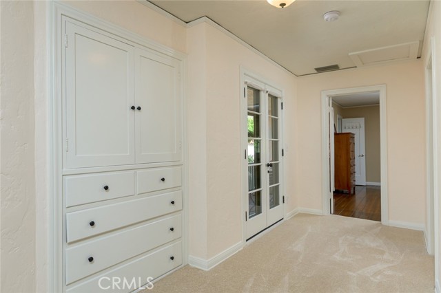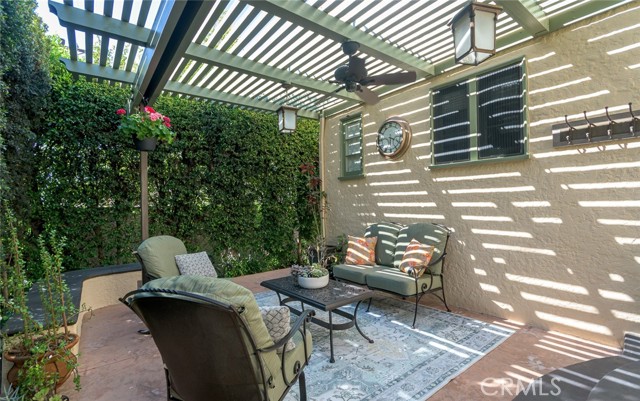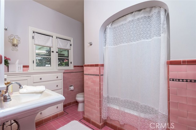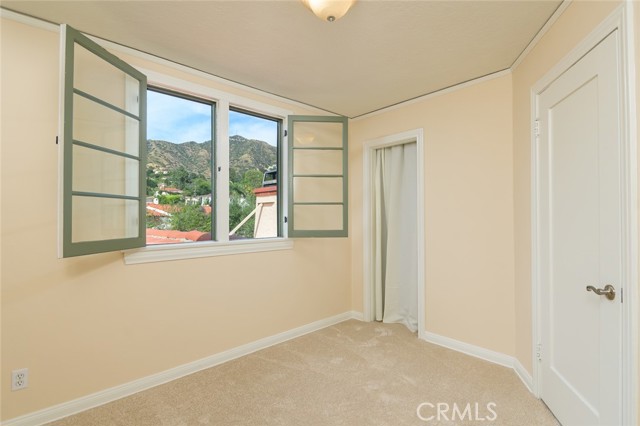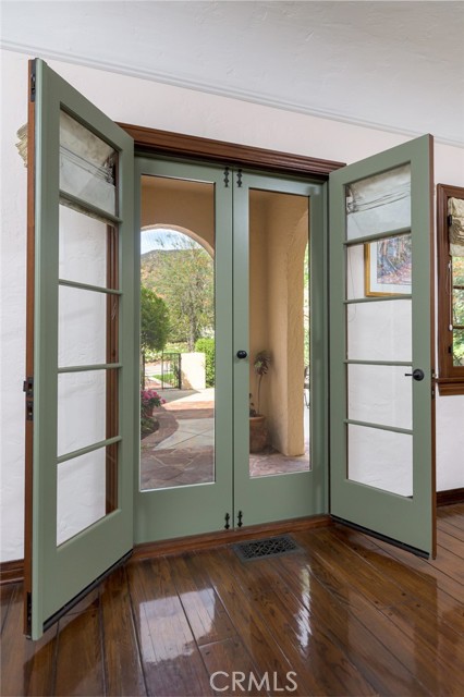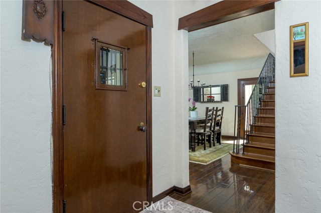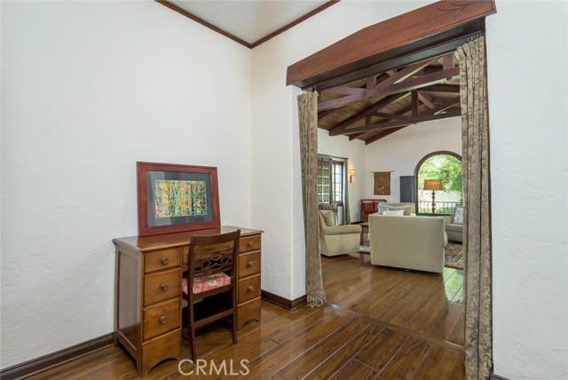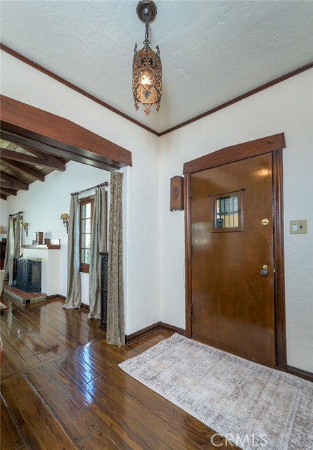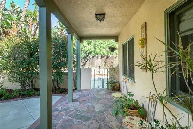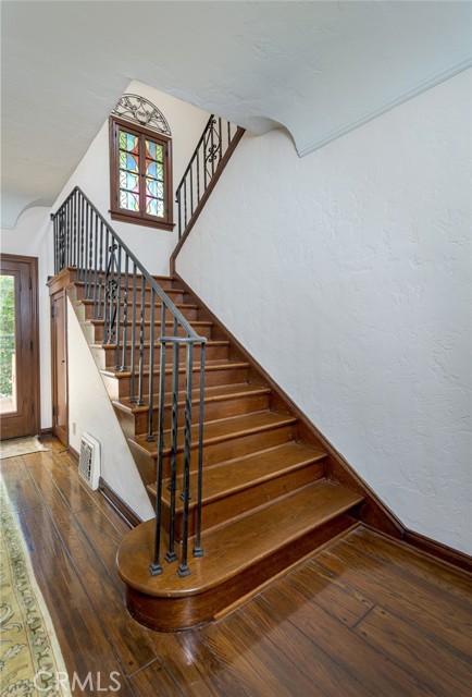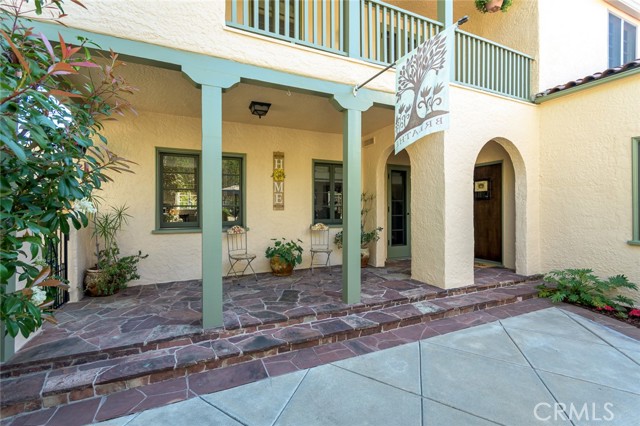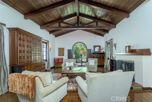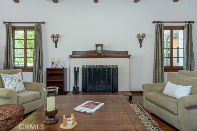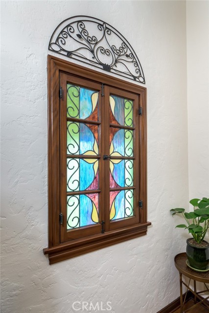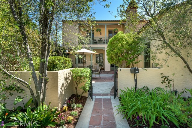 Spanish Revival Architecture is having a major moment and this home showcases all of the signature design elements that make this style so popular, features like arched doorways and a large picture window, dark wood ceiling beams, wood-framed French windows, wrought-iron railings and fixtures, a handsome fireplace and hearth trimmed in Spanish tiles, intricate carved wood detailing at the mantle and decorative lintels, and a delightful little niche in the hallway. From the moment you enter through the wrought iron gate, you're welcomed by a large, vibrant courtyard designed for entertaining or relaxing beside the peaceful fountain and outdoor fireplace. This blend of classic architecture from the 1920s has all of today's modern conveniences and luxury as well. The well-designed kitchen is outfitted with top-tier Wolf appliances, a Shaws handcrafted sink and custom Wood Mode easy-clean cabinets. (You'll have to look closely to find the seamlessly integrated refrigerator and dishwasher.) The charming breakfast nook with its built-in seating is perfect for morning coffee or a cozy casual dining area. This nook also offers a wall of cabinets and a lighted, glass display case. The adjacent laundry room provides additional cabinet space. One thing is for sure: you won't lack for cabinet space here! Polished peg and groove wood floors in the living room and formal dining room add to the richness and beauty of this home. Climb the wood staircase with its wrought-iron railing and experience the beauty of the large stained glass window above the landing. Upstairs, the spacious primary bedroom offers French doors to a private balcony overlooking the courtyard with pleasant views of the Verdugo Mountains. The adjacent retreat is ideal for a home office or a quiet space for reading. The primary bath has tile floors and wainscoting, a pedestal sink, a separate tub and shower and a banco with flanking cabinets. Three of the four bedrooms are on the upper level and two of the bedrooms have vanities (one up and one down). Whether it's in the expansive front courtyard or the more intimate back-yard patio with a waterfall spa and built-in BBQ, this home is designed for entertaining. Meticulously maintained, this is a golden opportunity to own a home that provides historic charm while delivering modern livability.