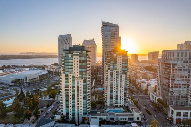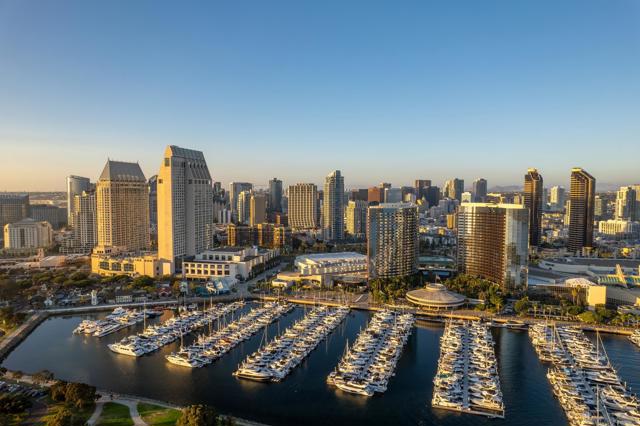 Spacious & bright corner unit with incredible panoramic views of downtown San Diego from every window! Located in the heart of the marina district, this chic condo in Horizon South has been updated with travertine flooring, a stone-surround gas fireplace, premium light fixtures, ceiling fans, and new modern doors and hardware. The well-designed layout includes a versatile den, perfect for a home office, fitness area, or creative studio, offering flexible space to fit your lifestyle. The kitchen boasts stainless steel appliances, crisp white cabinetry, and granite counters. The primary bedroom features a large walk-in closet, blackout shades, access to the patio, and an ensuite bath with a shower/tub combo and plenty of cabinet storage. Additional features include a second bathroom with a walk-in shower and an in-unit laundry closet large enough to accommodate a full-sized washer and dryer! Enjoy beautiful sunset views of Downtown from your spacious, private patio. Resident amenities include a gym, pool, spa, conference room, lounge, updated lobby area, storage unit, EV chargers, guest parking, and 24-hour gated security. Horizon residents enjoy year-round socials for the entire community. Ideally situated just steps to The Rady Shell and adjacent to a dog park, with easy access to Padres games at Petco Park and year-round concerts without the hassle of downtown parking. You’re also moments from Seaport Village, the Gaslamp Quarter, Little Italy, and San Diego’s incredible calendar of events.