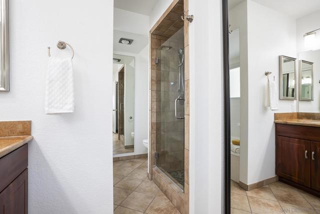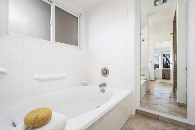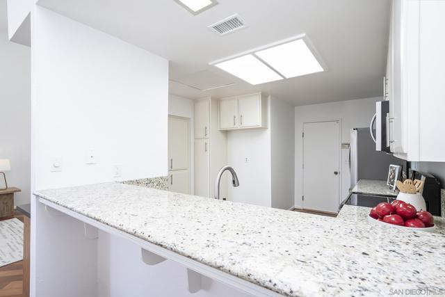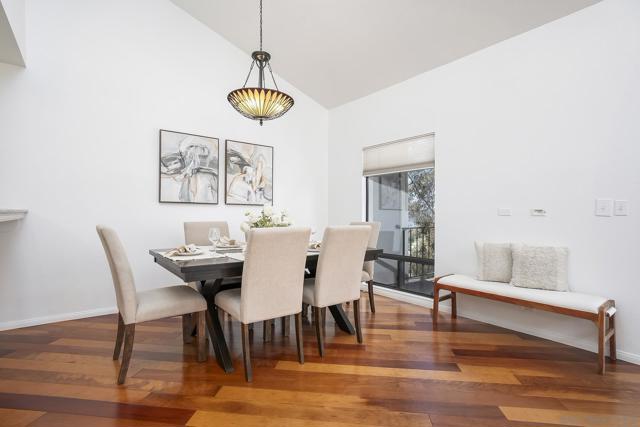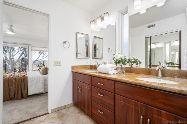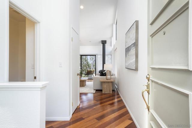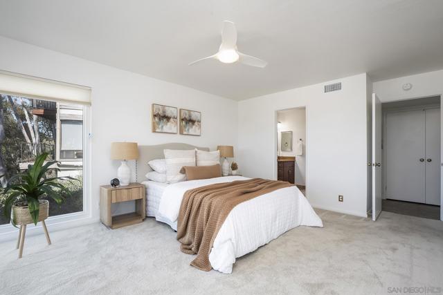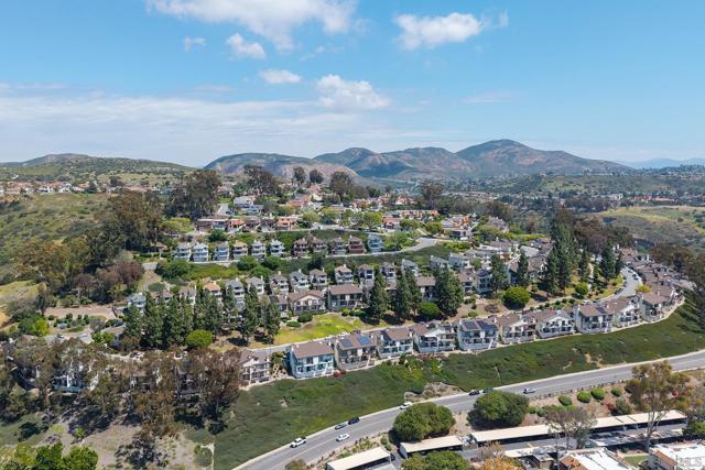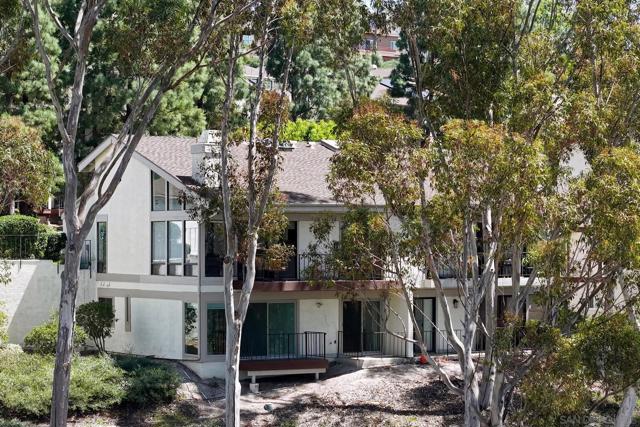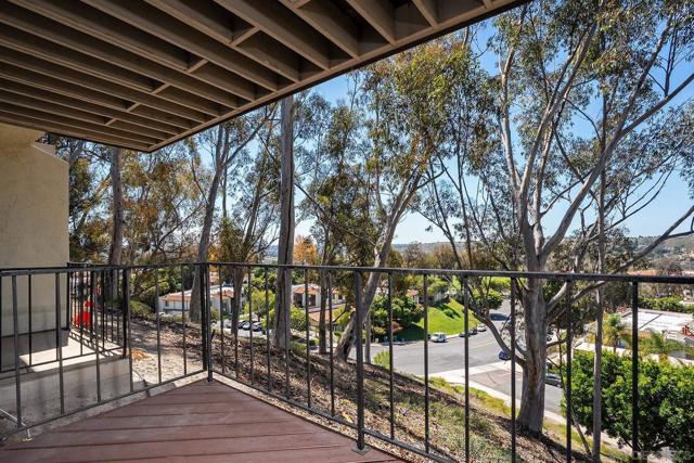 Spectacular southwest sunset views from this tree-top townhome overlooking Admiral Baker Field and Mission Trails canyon. Move-in ready 2-bedroom, 2.5-bath home with an open floor plan, abundant natural light, vaulted ceilings, wood floors, and a striking mid-century modern fireplace. The main living level features the living room, kitchen, and dining area, all capturing breathtaking views and cool afternoon breezes, along with a spacious deck perfect for relaxing or entertaining. The lower level includes two bedrooms, each with its own ensuite bathroom and private deck. Thoughtfully designed with only one shared wall, the home lives like a private residence. Community pool and plenty of street parking. They simply don’t build homes like this anymore.
