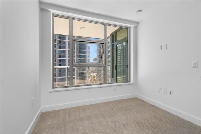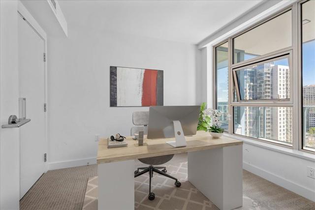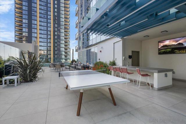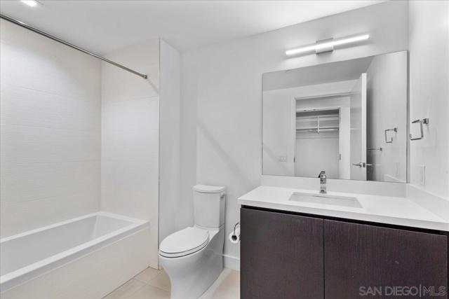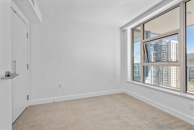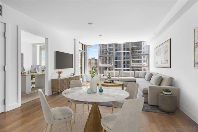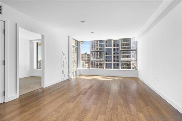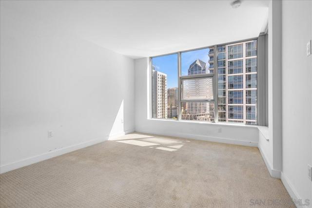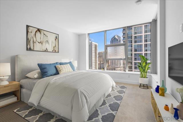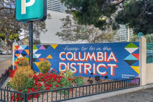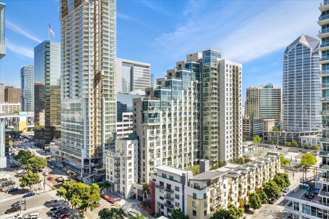 Welcome to sophisticated downtown living in the highly sought-after little Italy & Columbia neighborhood! This stylish 2 bedrooms, 2 bathrooms condo in the Savina complex offers modern comfort with an open-concept layout and abundant natural light. The kitchen features sleek cabinetry, solid surface countertops, and stainless steel appliances, seamlessly flowing into the spacious living area perfect for entertaining or relaxing. Enjoy a private balcony with city ocean views, ideal for morning coffee or evening unwinding. The generously sized bedroom includes ample closet space. Additional highlights include in-unit laundry, central A/C, and assigned parking. Residents enjoy resort-style amenities such as a fitness center, pool, spa, and secure building access. Located just steps from dining, shopping, Petco Park, and the waterfront, this home offers the ultimate urban lifestyle in the heart of San Diego.