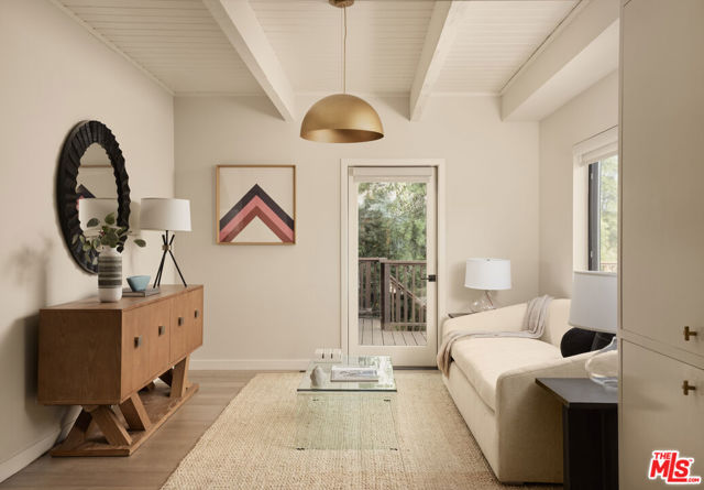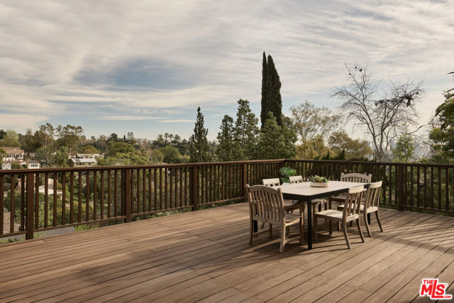 Set on one of the coveted flat streets in the hills of Elysian Heights, this modern A-frame inspired residence offers striking architecture, thoughtful design, and an exceptional sense of space across a light-filled foot floor plan. Soaring ceilings, warm materials, and curated finishes create a seamless balance of rustic charm and modern convenience.Upon arrival, a welcoming entry and oversized mudroom establish a sense of flow and intention. The main living areas unfold into an expansive great room where vaulted tongue-and-groove ceilings, clerestory windows, and a gas fireplace set a warm yet dramatic backdrop. The kitchen is both streamlined and expressive, outfitted with integrated appliances, open shelving, custom lighting, abundant storage, and connects naturally to an intimate den perfect for casual evenings or quiet mornings. Natural light pours throughout the 4-bedroom, 3-bath home via multiple skylights. The main level also includes a bedroom, full bath, and laundry area. Public spaces extend outdoors to an expansive 1,800+ square-foot refinished deck overlooking treetops, rolling hillsides, Downtown Los Angeles views, and a resort-style saltwater pool, spa, and fire pit ideal for entertaining or unwinding in total privacy. Upstairs, the serene primary suite offers dual closets and a beautifully designed bathroom with a soaking tub, walk-in shower, and dual-sink vanity. Two additional bedrooms and a full bathroom complete the second level. A detached office/gym provides a quiet, private space for work or creative pursuits. Meticulously updated interiors showcase designer finishes, custom millwork, and thoughtful details throughout. Updated systems and solar panels complete the offering. Ideally situated in Echo Park, just steps from the outdoors and moments from neighborhood favorites, Sunset Boulevard, and Silver Lake, this home delivers inspired design, effortless indoor-outdoor living, and a true urban hillside escape.