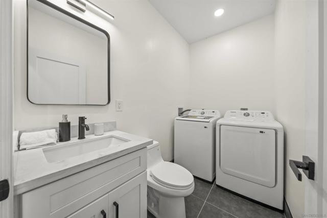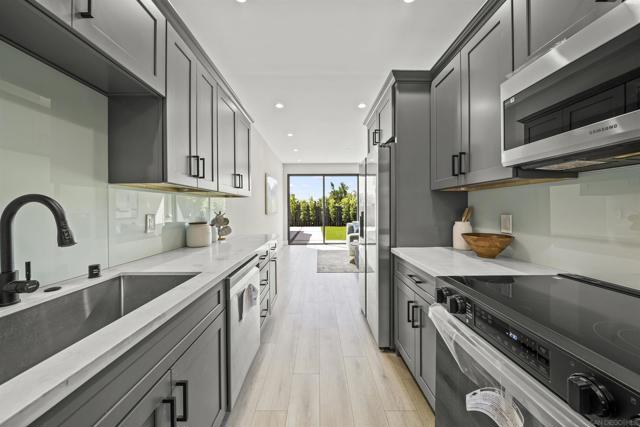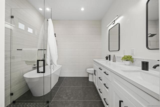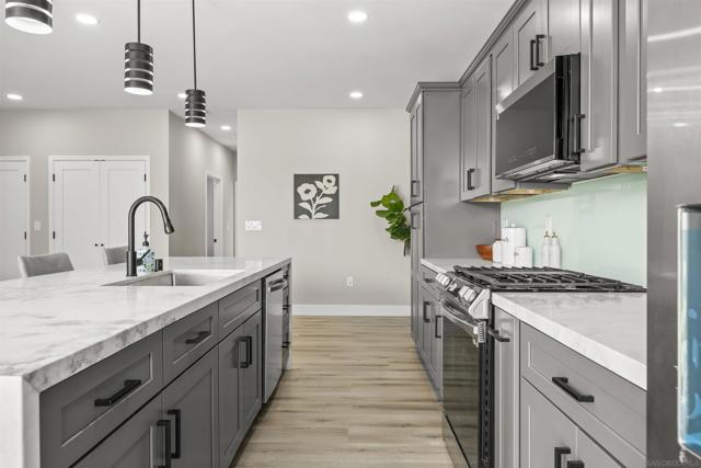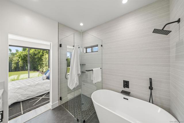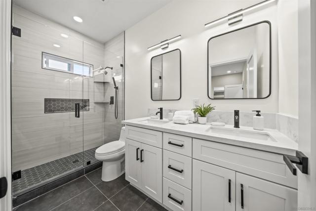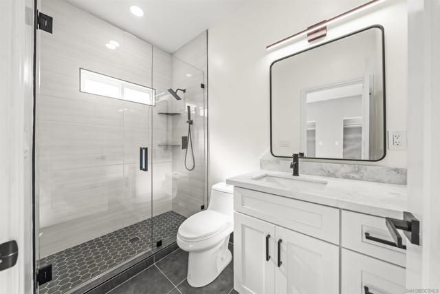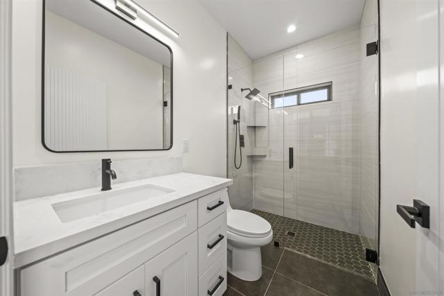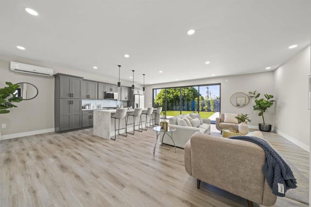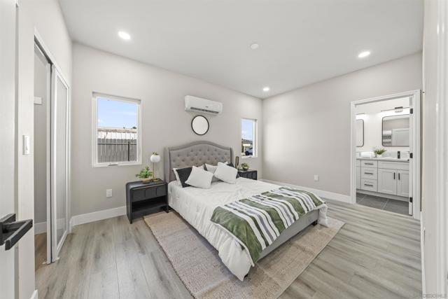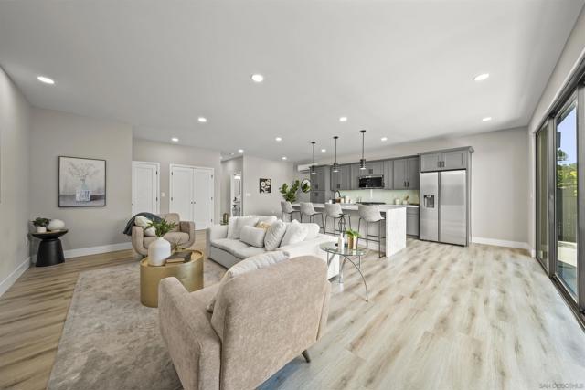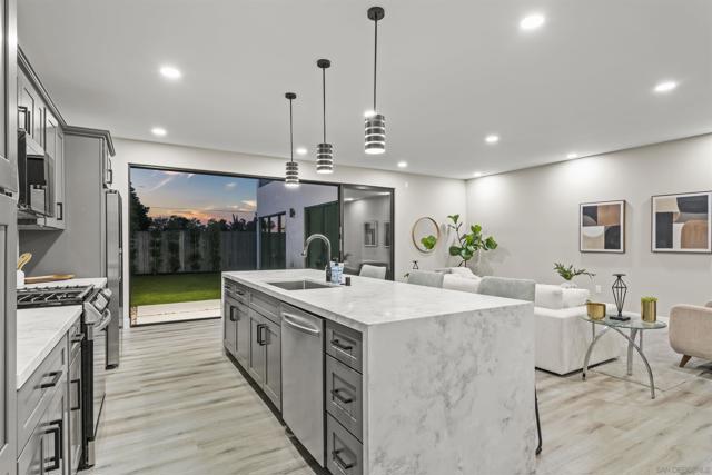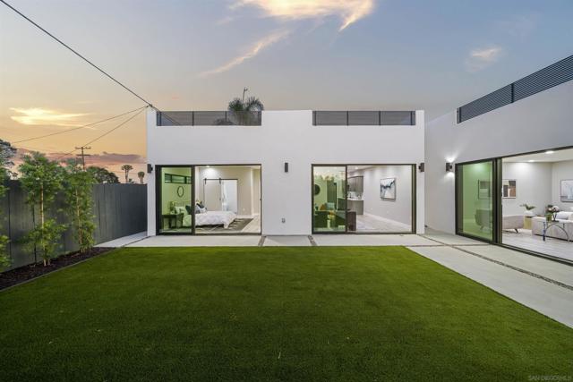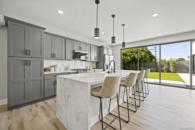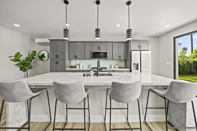 Welcome to this stunning NEW CONSTRUCTION single-story home with attached ADU that has separate entrances. PERMITS WERE OBTAINED. All bedrooms are primary suites and ceiling height is 9 feet all around. All new windows, multi-slide doors, stainless-steel appliances, custom quartz countertops throughout, kitchen island, contemporary front doors, custom garage door, roof top decks with lighting including stairs, new mini splits AC system in each unit, tankless water heater, walk in closet in primary ADU, dual closets in other bedrooms, new landscaping and patio areas, water and scratch resistant vinyl flooring throughout, bathrooms are custom tiled showers, vanities, with all new fixtures. Both units have open floorplan which flows into the living area, kitchen, and patio areas upon entry. New electrical, sewage, and plumbing. The roofs were done with westcoat water proofing and TPO both include 20-year warranty. Both units were framed in with the option to build up at a later time; the existing property was taken down to 3 walls. Separate SDG&E meters.