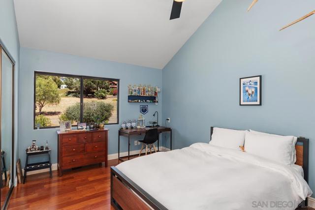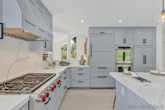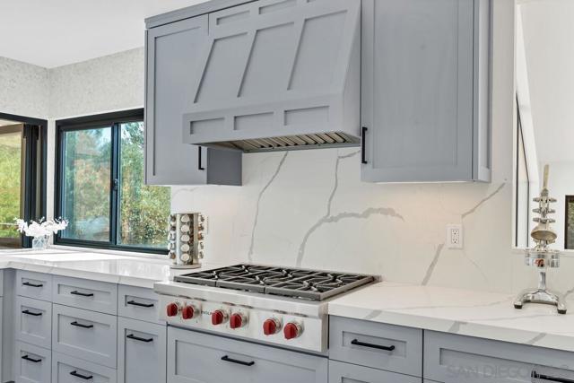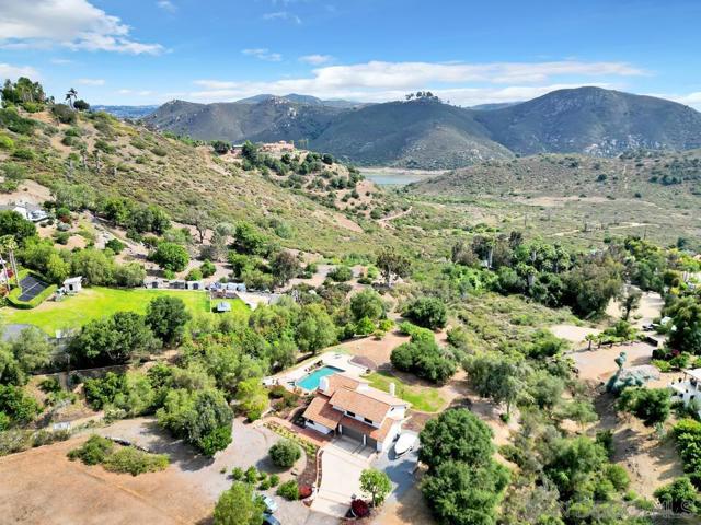 Call for incentives! Views Forever! Zoned Equestrian! Nestled in the sought-after Lake Hodges area, this exquisite custom home on a generous 1.33-acre lot offers views of the lake, rolling hills & majestic mountains. Inside-outside living is possible on three levels of this thoughtfully remodeled home. The property features luxurious upgrades & high-end finishes throughout. Enjoy sunny days by the oversized pool and hot tub or dine al fresco on the charming patio adjacent to the living area. The gourmet chef’s kitchen is equipped with top-of-the-line finishes, including quartz countertops, a Sub-Zero refrigerator, a Wolf range, and a Fisher & Paykel dishwasher. The kitchen, upper bathroom cabinets, and multiple built-ins are custom-crafted by a master cabinetmaker while the lower-level bathroom includes a floating vanity and vessel sink from Native Trails. The recently remodeled kitchen and bathrooms include high end Kohler fixtures. The property also includes a La Cantina kitchen window offering a seamless pass-through perfect for entertaining. The custom-designed laundry room offers ample storage and additional bespoke cabinetry with hidden extras such as a pull-out ironing board, extra power outlets, and an oversize stainless sink. Work from home? No problem in a private allocated office on the mezzanine level with more sweeping views. The primary bedroom features a custom walk-in California Closet and a beverage bar with a Zephyr refrigerator perfect for late-night beverages or early morning coffee or tea. The private deck situated off the master is ideal for enjoying sunsets and sunrises! The master bath is equipped with a soaking tub, a rain shower, body jets, and a custom floating dual vanity with a powered hair dryer storage drawer. The backyard hosts a variety of fruit trees including apples, limes, multiple varieties of oranges, grapefruit and avocado as well as olives, loquats and figs. Zoned irrigation ensures all plants will thrive. Space abounds to keep animals, build an ADU, park your boat or RV, toys, or work truck. Experience the perfect blend of elegance and tranquility in this exquisite retreat, providing a serene atmosphere while being only a five-minute drive from the 15 freeway, shopping mall, schools, and parks. This location offers convenient access to both nature and urban amenities, making it an ideal spot for those who appreciate both. Enjoy beautiful views and outdoor activities nearby while remaining close to essential services and entertainment options.