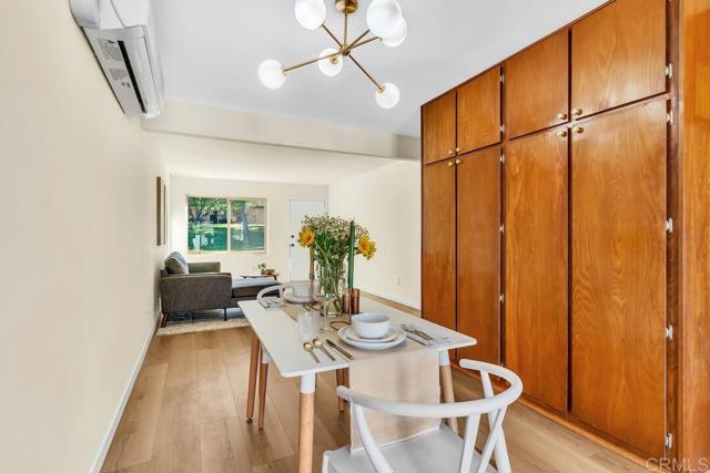 Welcome to this beautifully reimagined 2-bedroom, 1-bath condo in the heart of Santee, where thoughtful design meets effortless living. Spanning 817 sq ft, this home has been fully remodeled from its original 1972 condition into a light-filled California mid-century modern retreat. Step inside to find warm wood tones, clean lines, and an open, airy layout that flows seamlessly from the living space into the dining area and kitchen. The original cabinetry has been preserved and paired perfectly with modern updates, including LG kitchen appliances, Kohler fixtures, updated surfaces, and new flooring throughout—blending character with contemporary style. Enjoy year-round comfort with a newly installed mini split system, along with the added value of all new windows and a sliding glass door that bring in natural light while enhancing energy efficiency. The private patio offers a peaceful outdoor space and direct access to two convenient parking spots just outside—an incredibly rare and functional feature. Beyond the patio, you’ll find yourself adjacent to a sprawling greenbelt, creating a sense of openness and connection to nature. The community pool is just steps away and is currently being freshly refinished for your enjoyment. Located within walking distance to Mission Trails Regional Park and some of East County’s best hiking, this home offers the perfect balance of outdoor lifestyle and everyday convenience. Whether you’re a first-time buyer, downsizing, or looking for a turnkey investment—this one checks all the boxes.