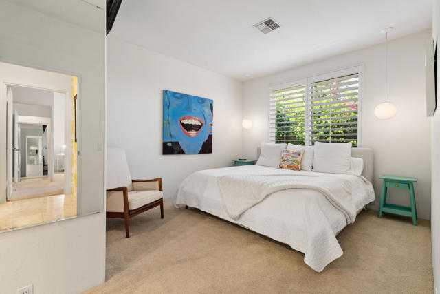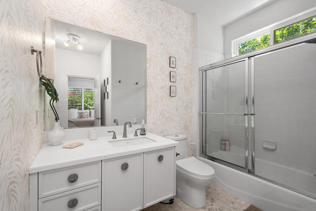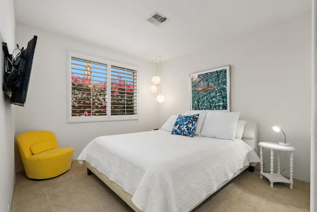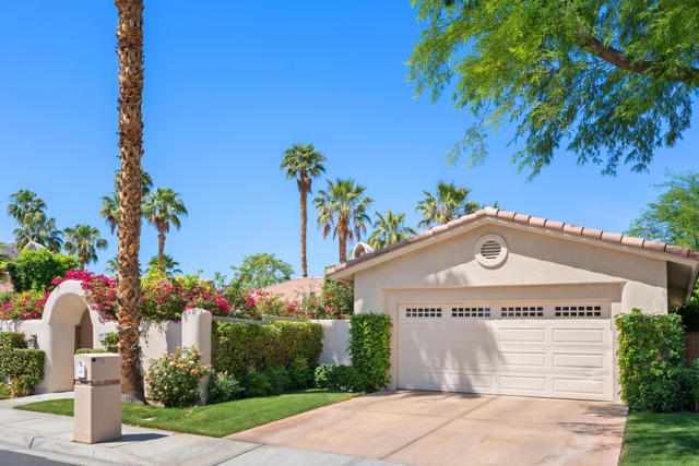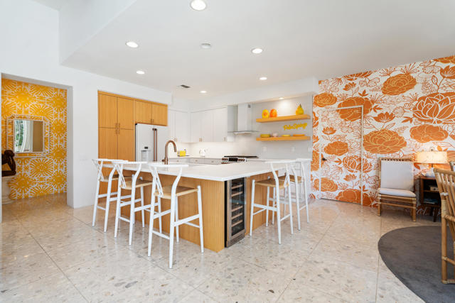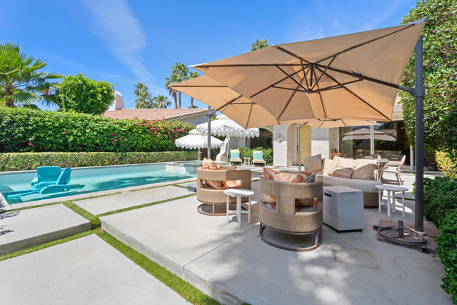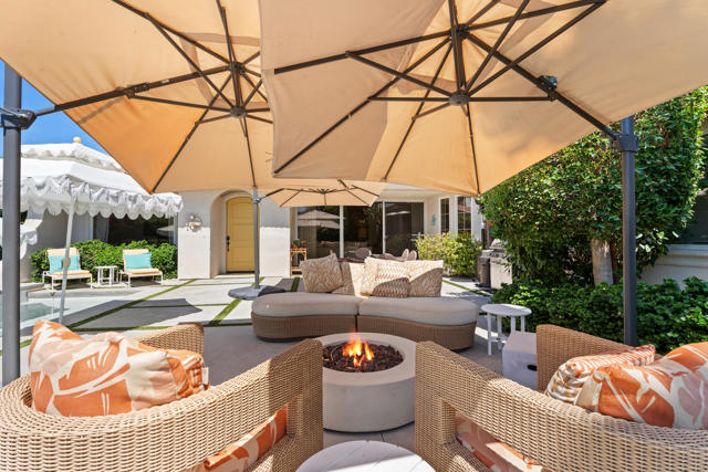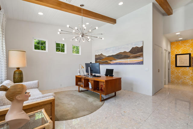 Step into a world where mid-century soul meets contemporary luxury in this meticulously reimagined Valencia Plan--the largest floor plan in the Ventanas enclave of Rancho La Quinta Country Club. Spanning 2,566 square feet, this one-of-a-kind residence is anchored by stunning Terrazzo flooring that flows seamlessly throughout. The grand living room serves as an architectural centerpiece, boasting an expansive vaulted ceiling with crisp tongue-and-groove planking, rich wood beams, and a feature wall of custom vertical wood paneling. This sophisticated aesthetic carries into the chef's kitchen, featuring two-toned cabinetry, airy open shelving, and a custom mosaic backsplash, all accented by elegant quartz countertops and a premium suite of GE Cafe appliances. Designed for both relaxation and high-end entertaining, the home offers three spacious bedrooms, three baths, a dedicated office, and a versatile bonus room. The primary suite is a true sanctuary, featuring a spa-like bath with a sculptural freestanding tub, a glass-enclosed shower against a geometric wood-tile feature wall, and a private outdoor shower for the ultimate desert experience. Outside, the lifestyle is defined by sun-drenched southern views and a contemporary front-loaded pool and spa, all strategically positioned to capture maximum sunlight while framing breathtaking mountain vistas. This property is an invitation to an elevated lifestyle where iconic design meets modern convenience and world-class amenities.