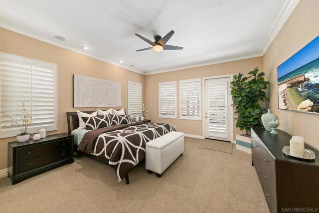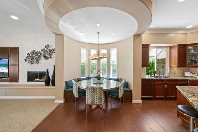High-design single-story home located on a cul-de-sac in The Arbors, south of Pomerado in Scripps Ranch. This residence features soaring ceilings, open-concept living, and extensive custom upgrades throughout. Grand double-door entry opens to a spacious interior with wood-look tile flooring, formal living and dining areas, custom built-ins, and 2 fireplaces. The chef’s kitchen includes custom solid cherry wood cabinetry, granite countertops, 6-burner gas range, double ovens, warming drawer, built-in refrigerator, microwave, wine fridge, and banquette seating, opening to an expansive family room with built-in media center. The primary suite offers blackout shades, spa-style bath with jetted and heated tub, custom cabinetry, brass fixtures, walk-in closet, and pocket door for privacy. The additional two bedrooms are generously sized, one with an ensuite bathroom. The fourth bedroom is thoughtfully designed as a sophisticated office. Resort-style backyard with outdoor kitchen, covered dining area, fireplace, and covered/enclosed spa with pool heater, plus mature citrus trees. Upgrades include owned solar, dual-zone HVAC (2 A/C units), new tankless water heater, new soft water system, reverse osmosis water system, whole-house fan, and backyard sound system, crown molding, and custom wood shutters. 3-car garage. Prime location near top-rated schools, parks, shopping, and I-15 access.