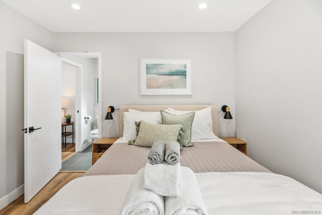 FURNISHED MIDTERM RENTAL — Designer Canyon House in La Jolla Experience elevated coastal living in this newly built modern 3BR / 2BA ADU with breathtaking canyon and skyline views. Thoughtfully designed by Suzanne Brown Designs, this elegant two-story home combines high-end finishes with comfort and functionality—perfect for extended stays, relocations, or remote professionals. Main living area features open-concept flow, abundant natural light, and sliding doors to a serene backyard with firepit lounge seating. Gourmet kitchen includes stainless steel appliances, full fridge/freezer, and dining table for four overlooking the canyon. Downstairs bedroom/TV room offers a king sleeper sofa with barn-door privacy, flat-screen TV, and full bath nearby. Upstairs, a loft office provides a dedicated workspace. Two additional bedrooms share a Jack-and-Jill bath with modern glass shower. Primary suite features a king bed, mirrored closet, and panoramic canyon-to-city views; guest bedroom includes a queen bed and walk-in closet. Additional highlights: full-size washer/dryer, stylish furnishings, and convenient location minutes from La Jolla beaches, shops, dining, and downtown San Diego. Sleeping Setup (max 6): BR1 King • BR2 Queen • BR3 King Sleeper Sofa • 2 Baths Rates reflect short-term rental pricing and vary by season and length of stay. Published amounts are estimates; final pricing, fees, and availability are subject to change until a signed agreement. Please inquire for an exact quote.