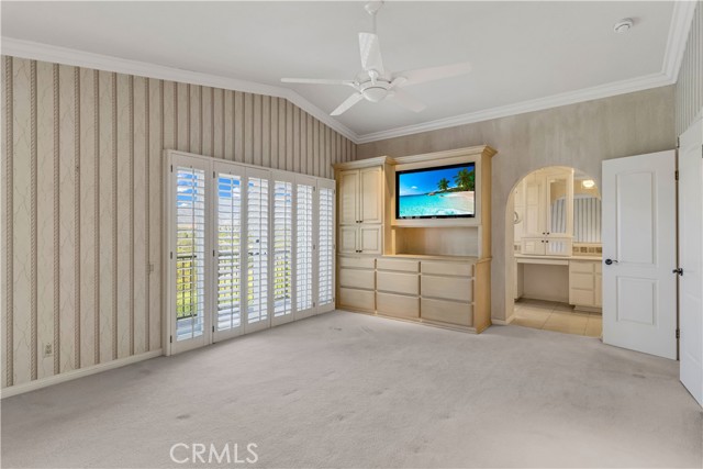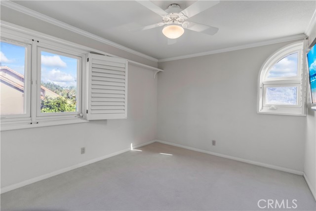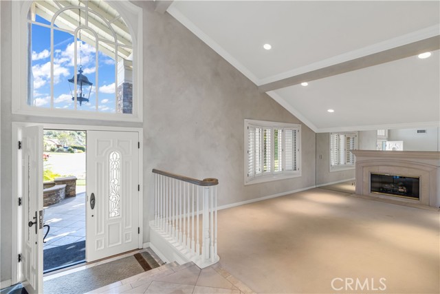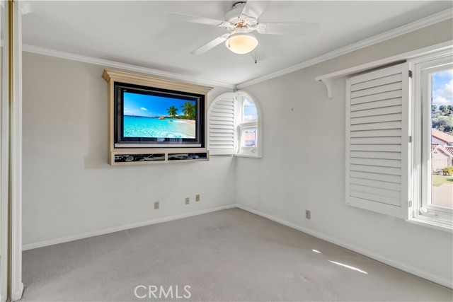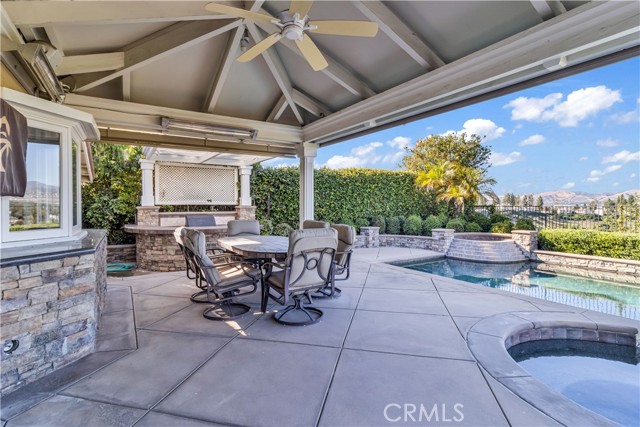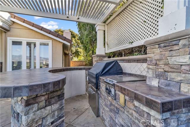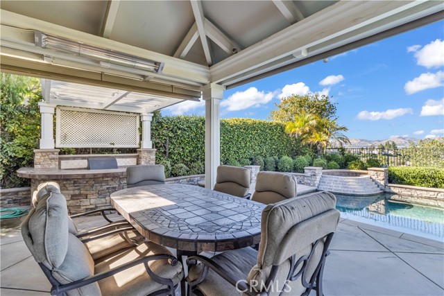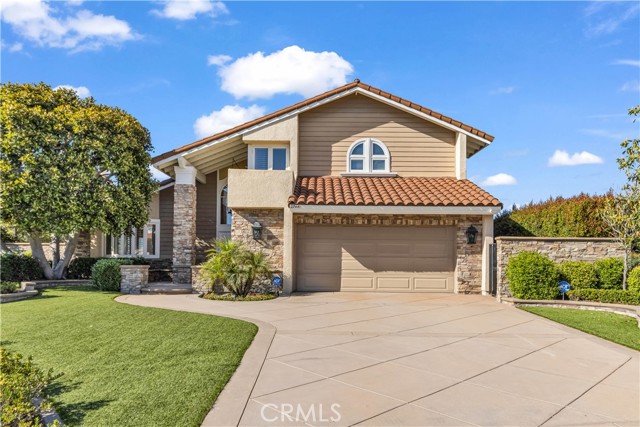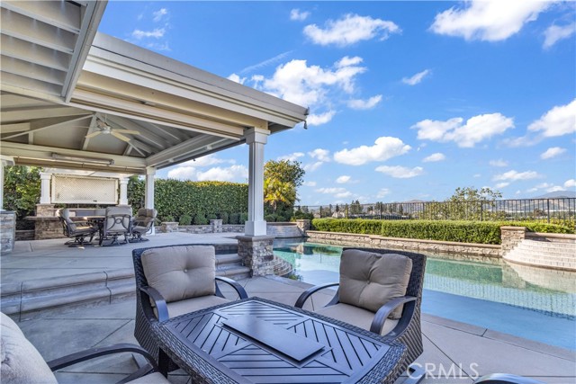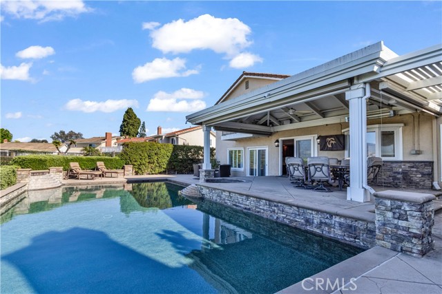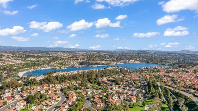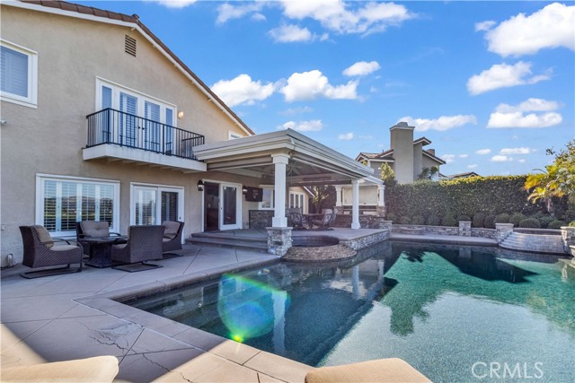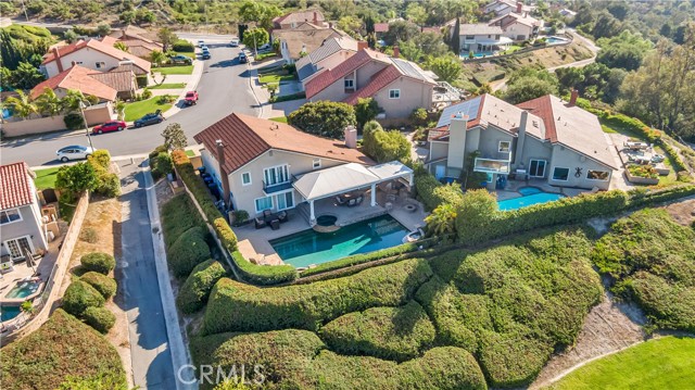 Welcome to your own private resort like oasis, ideally situated high in the hills of Madrid Del Lago, offering total privacy, yet capturing unbelievable unobstructed panoramic view of saddleback mountain and city lights. No expense spared for the exterior and landscaping of this home. The relaxing resort like backyard features a private unique covered patio with roll down shades, heater, and T.V., inviting you to relax in hot or cool climate and enjoy your sparking salt water pool, spa, waterfall and BBQ Island. The existing backyard furnishing is included. The interior has been re-designed and customized for comfort of everyday living as well as entertaining. The primary suite offers a private balcony with scenic outlooks, a cedar-lined walk-in closet, built-in dresser, dual vanities and a walk-in shower. The secondary bedrooms share a hall bath with a jetted tub. A convenient downstairs guest bath includes a walk-in shower. Craftsmanship and quality of improvement are evident throughout, including custom built ins, granite counters, full home re-pipe, speaker system throughout, alarm system setting, and many customized features. The resident will also enjoy access to community walking trails, lakeside dinning, and exclusive membership to Lake Mission Viejo offering beaches, boating, concerts, and year around events.
