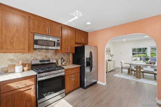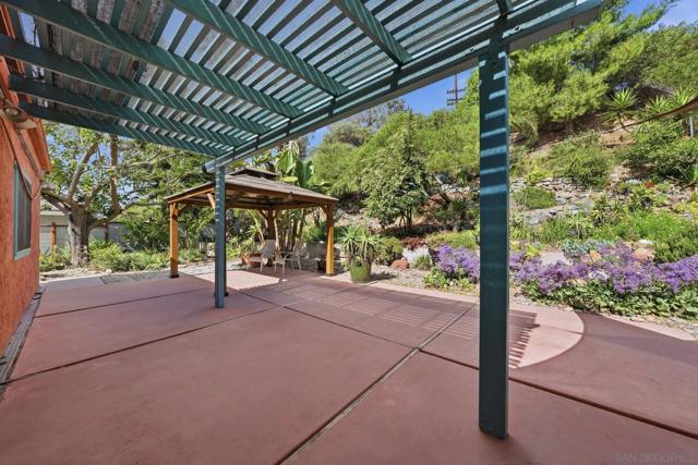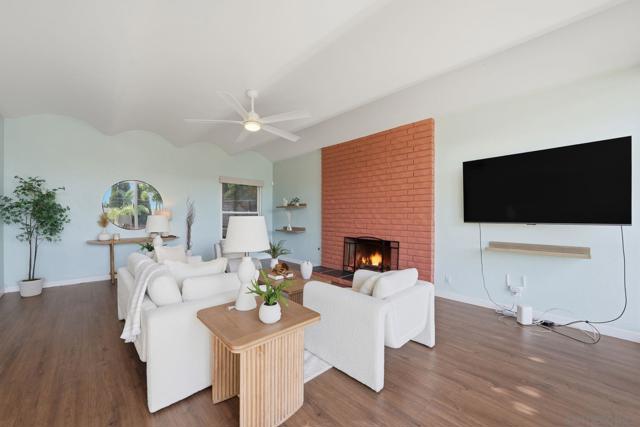 This beautifully upgraded residence showcases refined modern living with designer finishes and premium enhancements throughout. The expansive living room is a true statement space, highlighted by distinctive conclave ceilings and an abundance of natural light pouring through floor-to-ceiling windows. The open-concept kitchen seamlessly connects to a spacious dining area, creating an ideal setting for elevated entertaining. No detail has been overlooked, with recent upgrades including a new back sliding door, sophisticated recessed lighting throughout the main living areas, ceiling fans in every bedroom and the living room, and custom blinds and drapery adorning every window. The home features fresh interior paint and all-new flooring, complemented by a new roof and energy-efficient solar system with Tesla Powerwall 2. Additional enhancements include 2 new skylights, thoughtfully installed shelving in the kitchen and living room, flat-screen TV mounts in the primary bedroom, living room, and kitchen, as well as a new stove and designer kitchen faucet—delivering both style and functionality in every space. A private outdoor retreat designed for year-round enjoyment, featuring a beautifully crafted wood pavilion with a covered roof and ceiling fan—perfect for relaxing or entertaining in comfort. The yard is further complimented with stylish shade sails, while lush, mature landscaping and greenery create a tranquil, resort-like ambiance with ample space for outdoor living and gatherings.