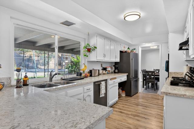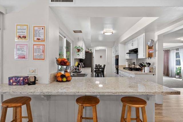 Welcome to this beautifully updated home in the heart of San Carlos, where space, privacy, and outdoor living come together perfectly for family life. Nestled at the base of Pyles Peak with sweeping views of Cowles Mountain, this property offers the rare opportunity to step out your back door and begin your hike directly into nature or enjoy your maturing fruit trees, which include persimmon, lime, cherry, and lemon trees. Inside, the home features stylish upgrades throughout, including brand-new flooring, fresh interior paint, and a beautifully remodeled kitchen with new quartz countertops. The spacious layout includes five rooms upstairs, giving families the flexibility they need. The primary suite features a private bath with granite countertops, dual sinks, a walk-in closet, and a private deck where you can relax while taking in scenic mountain views. The additional rooms include three generously sized bedrooms with large closets plus a versatile bonus room currently used as a home office, which could easily be converted into a fifth bedroom. Comfort and efficiency are covered with a powerful, like-new HVAC system and brand-new attic insulation, helping keep the home comfortable year-round. Step outside and enjoy one of the property’s most unique features: no neighbors behind you. Your backyard opens directly toward the base of Pyles Peak, creating a peaceful natural setting with added privacy and a feeling of expansive space rarely found in suburban San Diego. Located just moments from Mission Trails Regional Park and close to local schools, this home is also conveniently situated near the communities of Santee and La Mesa. Families will enjoy easy access to neighborhood parks like Tuxedo Park, nearby hiking trails, shopping centers, libraries, and everyday conveniences. Best of all, you’re only a short drive to San Diego’s beautiful beaches, vibrant downtown, and world-class attractions, making it easy to enjoy everything the region has to offer while coming home to the tranquility of San Carlos.