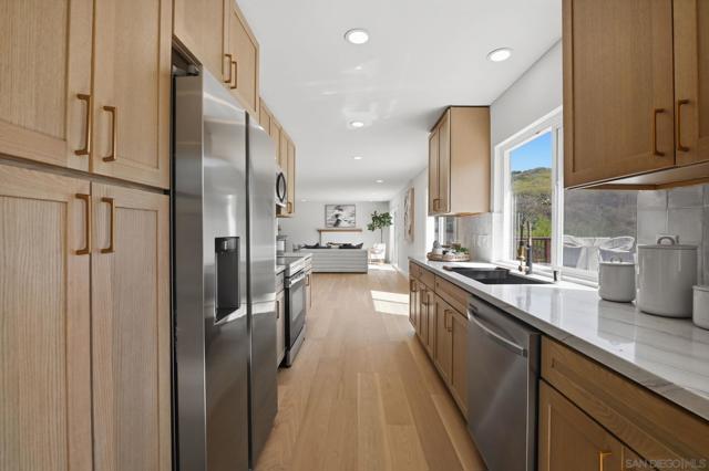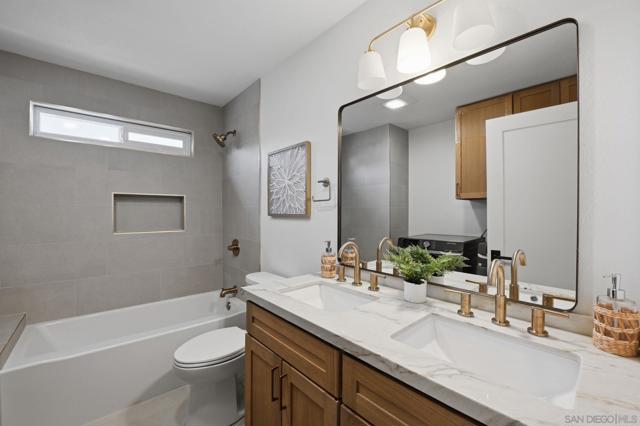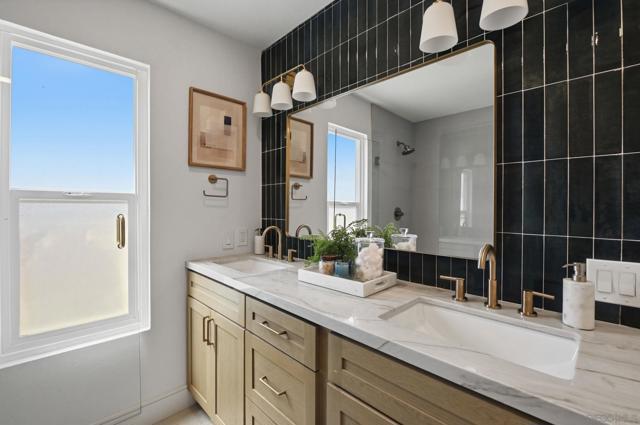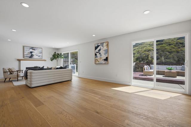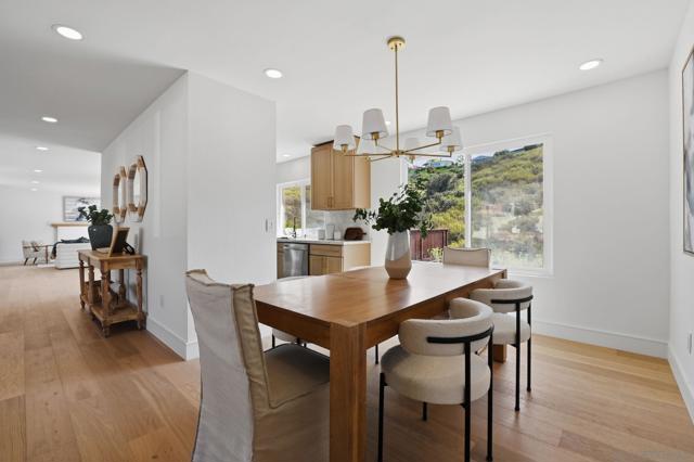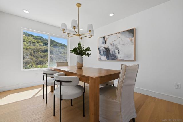 Tucked away on a quiet street just steps from Mission Bay, this completely renovated home feels like a hidden retreat with breathtaking canyon views and effortless indoor-outdoor living. From the moment you arrive, the home’s curb appeal sets the tone, with fresh exterior paint, low-maintenance landscaping, and a spacious, fenced-in front yard. Inside, the home opens to a bright, airy space where natural light pours through oversized windows, highlighting the new engineered wood flooring and fresh, modern finishes throughout. The layout flows beautifully, with a spacious family room leading into a dedicated dining area, perfect for both everyday living and entertaining. The beautifully updated kitchen features quartz countertops, new cabinetry, and new stainless steel appliances. Designed for both function and connection, it opens to an expansive living room, where a custom Venetian plaster fireplace becomes a stunning focal point, complemented by a beverage nook with a built-in wine fridge. Two sliding glass doors invite you outside to a freshly stained deck, an incredible space to unwind, entertain, and take in sweeping canyon views. Upstairs, the primary suite offers a peaceful escape, complete with a large window, a custom designed walk-in closet, and a beautifully remodeled ensuite bathroom featuring quartz countertops, dual sinks, and a walk-in shower. Three additional guest bedrooms and an updated full bathroom provide flexibility for family, guests, or a home office. Every detail has been thoughtfully upgraded, including a new roof, new washer and dryer, and HVAC mini splits in each bedroom for personalized comfort. All of this, just minutes from the natural beauty of Mission Bay and Tecolote Canyon, plus easy access to beaches, dining, and shopping, making this home the perfect blend of serenity, style, and location.