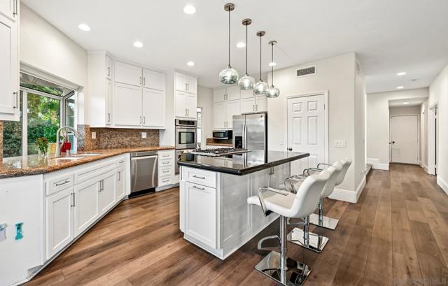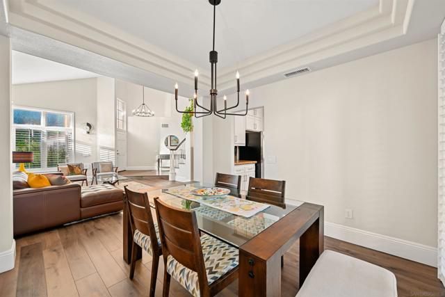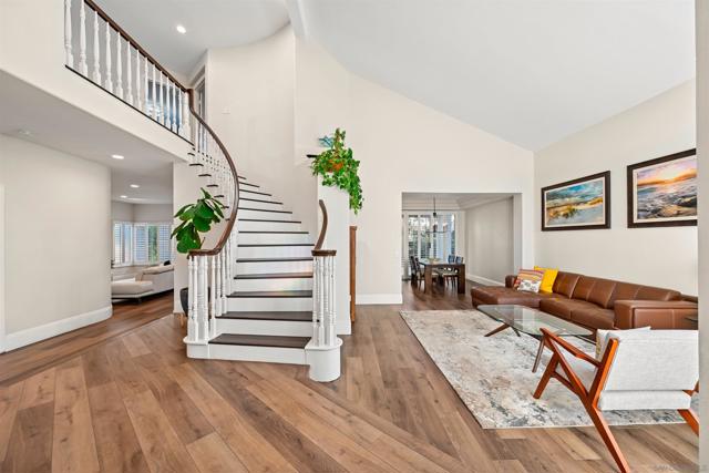Discover elevated living in this exquisite executive home in the sought-after Cantamar neighborhood of Carmel Valley. Perfectly positioned on a premium cul-de-sac, this picture-perfect residence blends timeless elegance with modern style. Enter through dramatic double doors into a grand foyer, where a sweeping curved staircase and soaring two-story ceilings create an impressive, light-filled welcome. The spacious living room offers the perfect setting to entertain or unwind and flows seamlessly into the formal dining room, highlighted by a tray ceiling for added sophistication. A desirable first-floor bedroom and full bathroom provide flexibility for guests or multi-generational living. The chef’s kitchen is both beautiful and functional, featuring sleek white cabinetry with self-closing drawers, granite countertops, an oversized island with bar seating, pendant lighting, stainless steel appliances, and a large walk-in pantry. It opens effortlessly to the inviting family room with a cozy fireplace. Designed for indoor-outdoor living, glass sliders lead to a spacious, beautifully landscaped backyard complete with artificial turf and a patio ideal for relaxing, entertaining, or dining al fresco. A laundry room with sink and storage, along with a three-car garage, completes the main level. Upstairs, the primary suite serves as a private retreat, offering a fireplace, a walk-in closet with built-in organizers, and a spa-inspired bathroom with quartz countertops, a soaking tub, and a large walk-in shower accented with decorative glass tile and herringbone stone flooring. A versatile loft, two additional bedrooms—one featuring a built-in bench and wainscoting and a secondary bathroom complete the upper level. Recent additions and features include luxury vinyl plank flooring throughout, plantation shutters, tall baseboards, a redesigned kitchen island, dishwasher, designer lighting fixtures, recessed lighting, ceiling fans, water heater, and an upgraded garage with epoxy floors, built-in cabinetry, and overhead storage. Ideally located near Carmel Knolls Park, The Bay Club, top-rated schools, and premier shopping and dining at Del Mar Highlands Town Center and One Paseo. Just minutes from the iconic beaches of Del Mar and La Jolla, with convenient access to I-5 and Highway 56, this home offers an exceptional opportunity to call your own!
