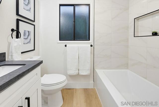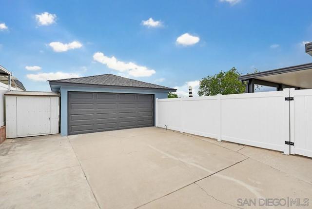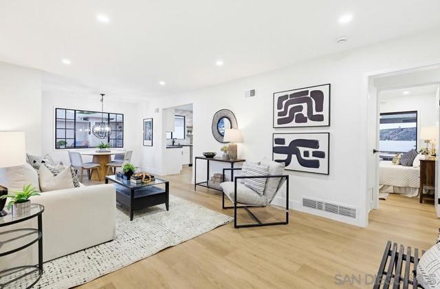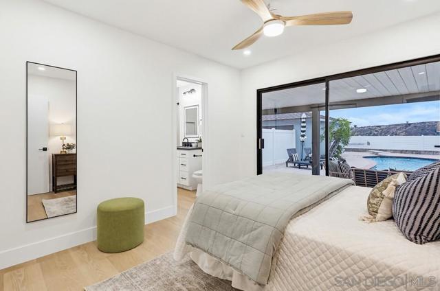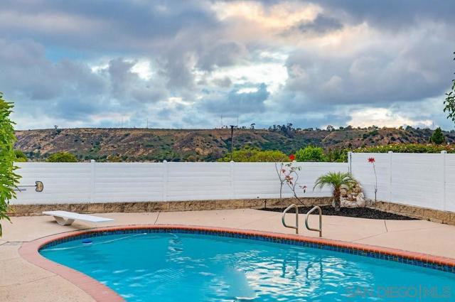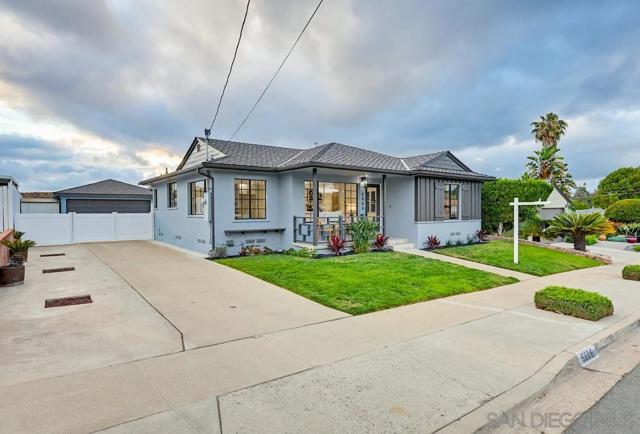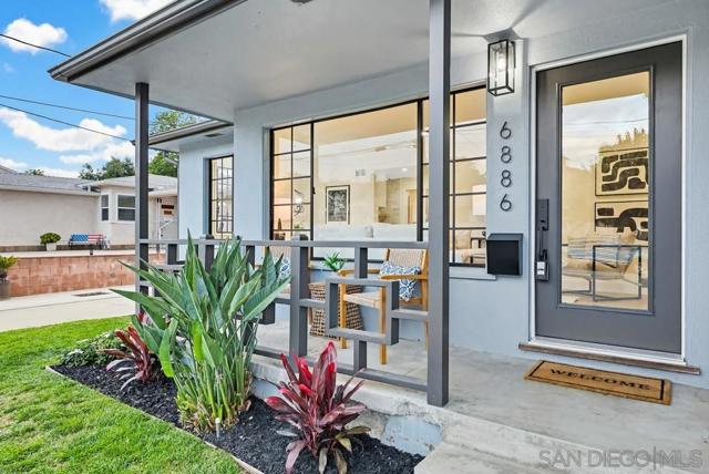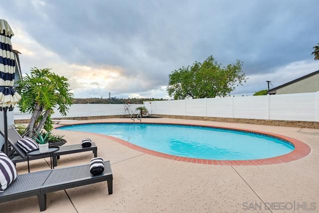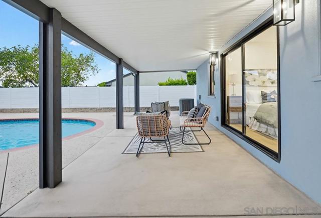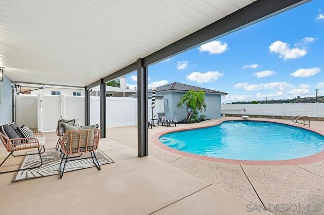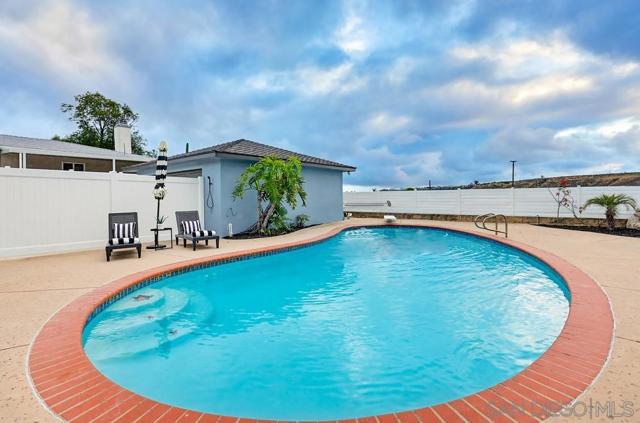 Turnkey and thoughtfully remodeled, this single-level Allied Gardens residence is centered around its standout feature, a spacious private sparkling pool that defines the home’s indoor-outdoor lifestyle and creates the ultimate setting for entertaining or relaxing year-round. A cozy front porch with seating adds a warm and inviting first impression,perfect for morning coffee. Inside, your home is filled with natural light and anchored by a stylish kitchen featuring white shaker cabinetry, sleek countertops, stainless steel appliances, and a classic subway tile backsplash. The living and dining areas connect seamlessly, creating an easy flow for everyday living. Bedrooms are well-proportioned, including a primary suite with direct access to the backyard, offering seamless connection to the pool and patio. Both bathrooms have been updated with modern finishes, including custom vanities, matte black fixtures, and designer tile work. The backyard is designed for enjoyment, featuring an expansive patio, covered outdoor living space, and a large, private pool that serves as the focal point of the home. The fully fenced yard enhances privacy and usability. A detached 2-car garage and extended driveway provide ample parking and potential for ADU conversion. Ideally located near Admiral Baker Golf Course and Allied Gardens Park and Recreation Center, and just minutes to Mission Valley and Fashion Valley Mall, this home has it all.