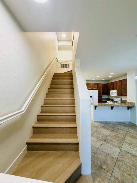 Selling Price: $799,000--$826,000. Rarely available view-facing townhome offering breathtaking mountain and valley views—unlike many units that face neighboring buildings. This exquisitely upgraded home blends privacy, scenery, and refined elegance. Featuring new Luxury vinyl plank flooring and designer tile flooring, fresh interior paint, and curated lighting and ceiling fan fixtures throughout. The gourmet kitchen showcases rich wood cabinetry, stone countertops, and generous prep space, flowing seamlessly into the living area with a custom built-in entertainment center—perfect for elevated everyday living and entertaining. The main level includes a guest bedroom, full bath, and a well-appointed laundry room. Upstairs, dual primary suites provide private retreats, each enhanced with custom closet organizers. Enjoy plantation shutters, abundant natural light, and a spacious 2-car tandem garage with storage space. Ideally located within walking distance to top-rated Poway Unified schools, shopping, library, and fitness centers. Community amenities include beautifully maintained parks and a resort-style pool. An exceptional opportunity for first-time homebuyers or investors seeking comfort, style, and long-term value.