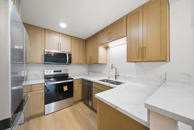 Welcome to this beautiful, newly remodeled home at the center of San Diego entertainment, comfort, enjoyment and convenience! Situated within walking distance of Fashion Valley and next to the highly anticipated Riverwalk, this home features a huge primary suite, with separate closets, a separate guest bathroom, and has spared no expense--from the finishes throughout, to the brand new kitchen, luxury vinyl large plank flooring, and gorgeous bathrooms. There is ample storage space not only inside the unit, but also a separate, private storage room (not just storage closet) that comes with the unit, as well as a private garage. The community is VA and Conventional Approved and comes with a sauna and pool, areas for furry friends and includes water/trash! Sit out on the large balcony, with exits from both the living room and bedroom and sip your morning coffee or unwind after a long day. You'll love to call this HOME!